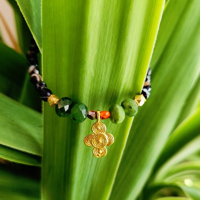 The 22kt Gold Overlay Jasper Bracelet is a timeless piece crafted with stackable elegance and gorgeous hues. The 22kt gold overlay will give a rich and luxurious sheen to your look. Handmade with exquisite care and attention to detail, this bracelet is sure to make a statement. Standard 7.5 sizing