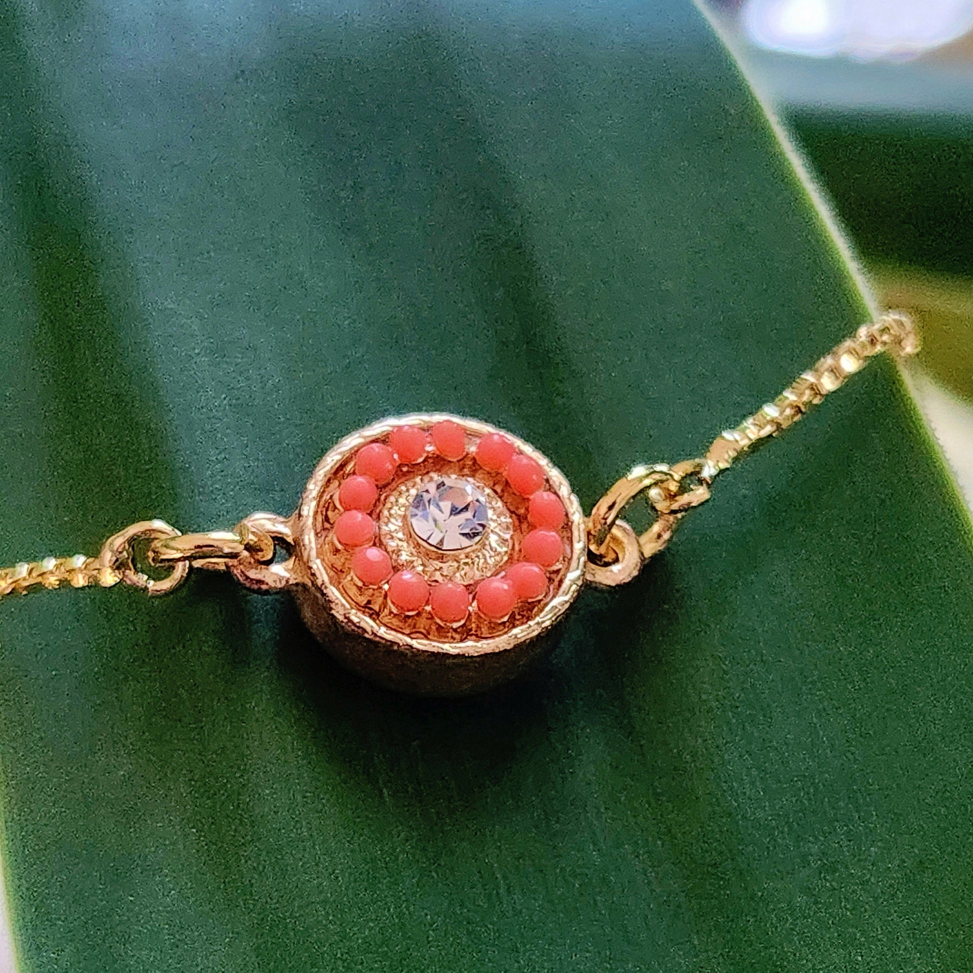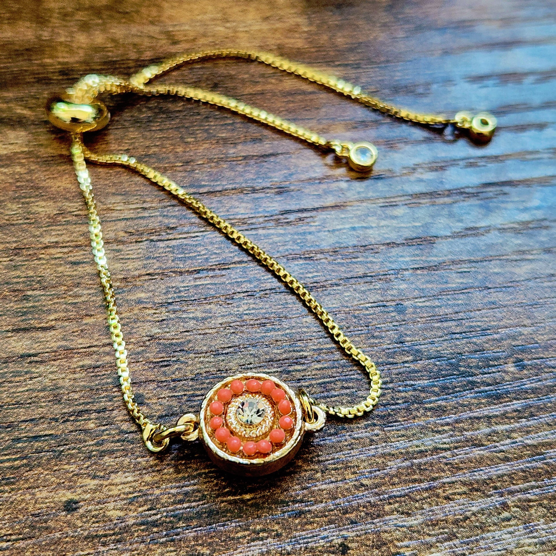 This Gold-Filled coral Adjustable Bracelet features a stunning oval bead and crystal focal that catches the light, adding a touch of elegance to any outfit. With its adjustable design, this bracelet is perfect for all wrist sizes and is sure to be a valuable addition to any jewelry collection.