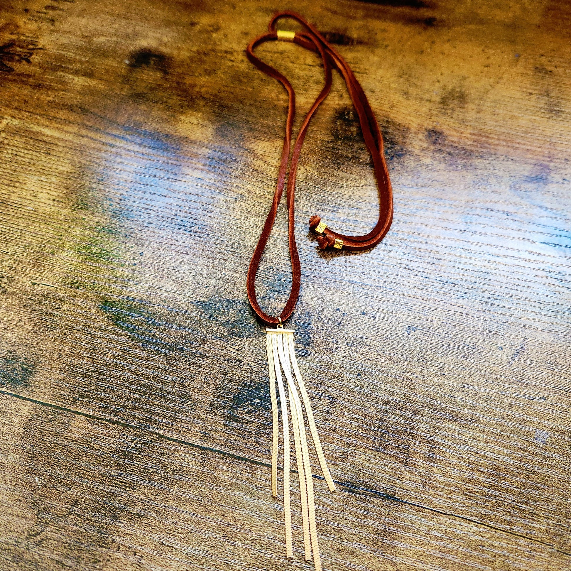 Crafted from rich mocha leather, this adjustable cord fringe necklace features a striking gold heribone focal. Designed for versatility, it can be worn as a chic choker or extended into a longer necklace, allowing you to customize your look with ease and sophistication. Ideal for those seeking a refined accessory that adapts seamlessly from casual to dressy occasions.