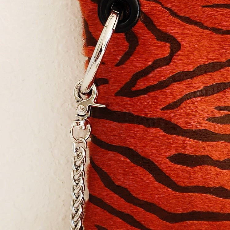 The Brunt Orange Zebra Crossbody Bag features a stunning hair-on zebra print, making it a bold and unique choice. The interior is lined with luxurious velvet and includes a small pocket for convenient organization. Elevate your style with this statement piece. Dimensions approximately 7" H x 10" W. Made in USA