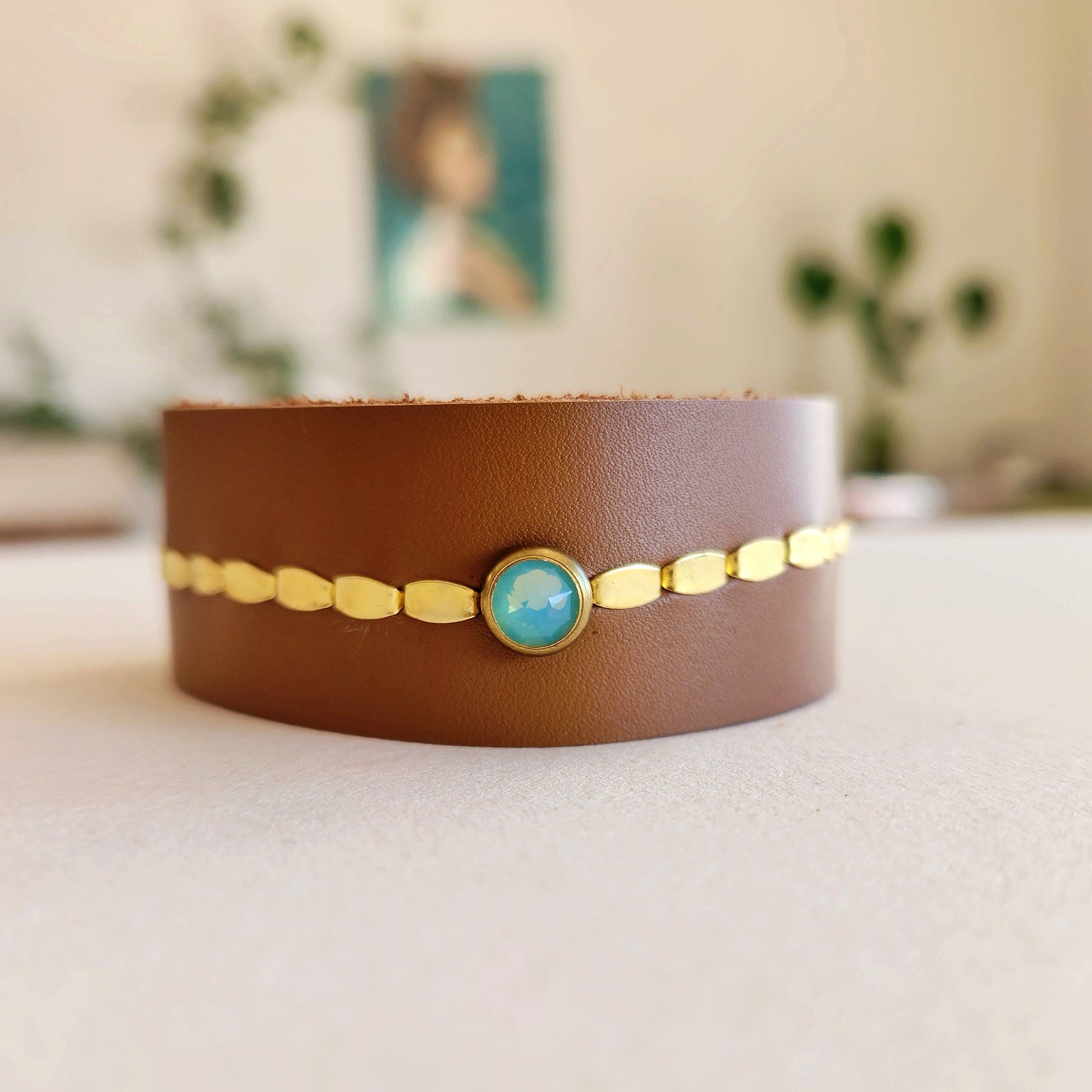 Crafted from soft leather, this tan cuff features a stunning faceted focal piece complemented by elegant brass elements. Designed for versatility, the cuff adjusts comfortably from 7.5 to 8 inches, ensuring a perfect fit. This blend of natural materials and refined metal accents creates a sophisticated accessory suitable for both everyday wear and special occasions.