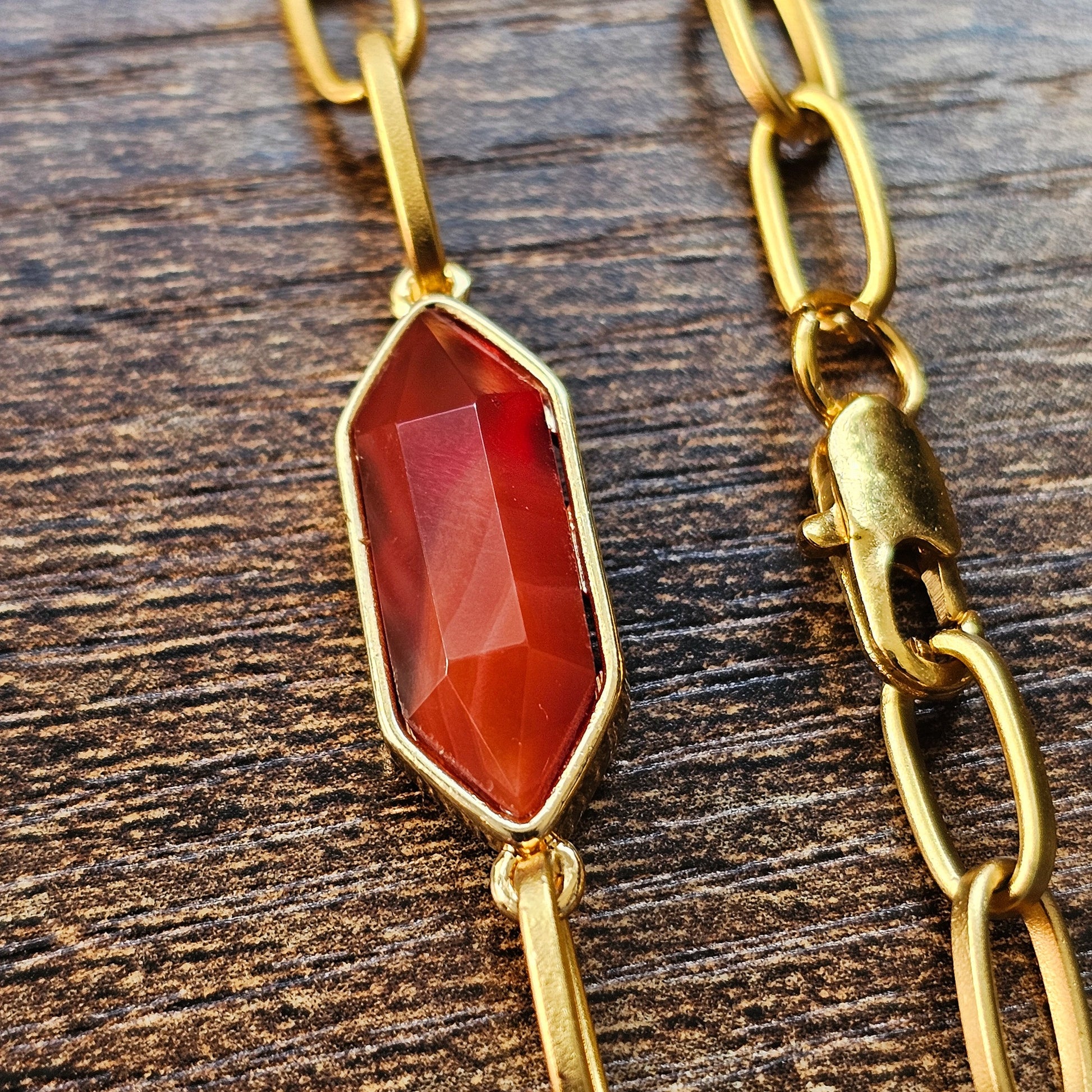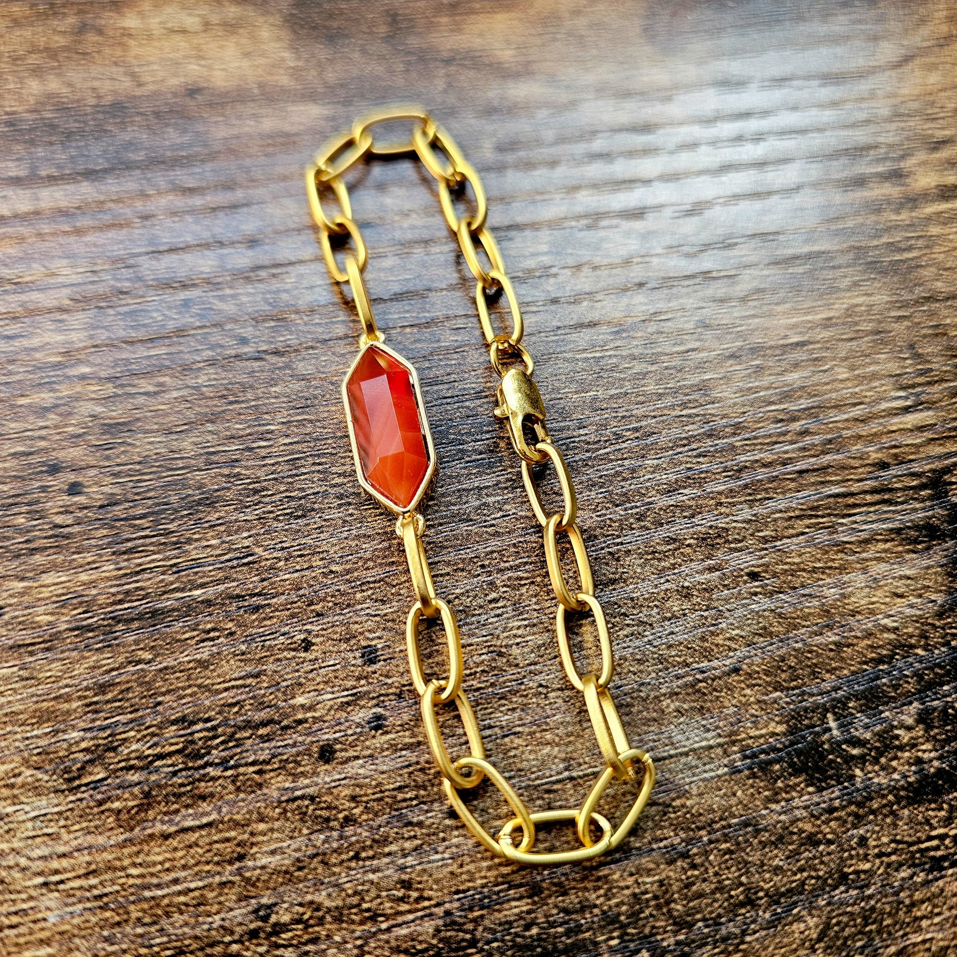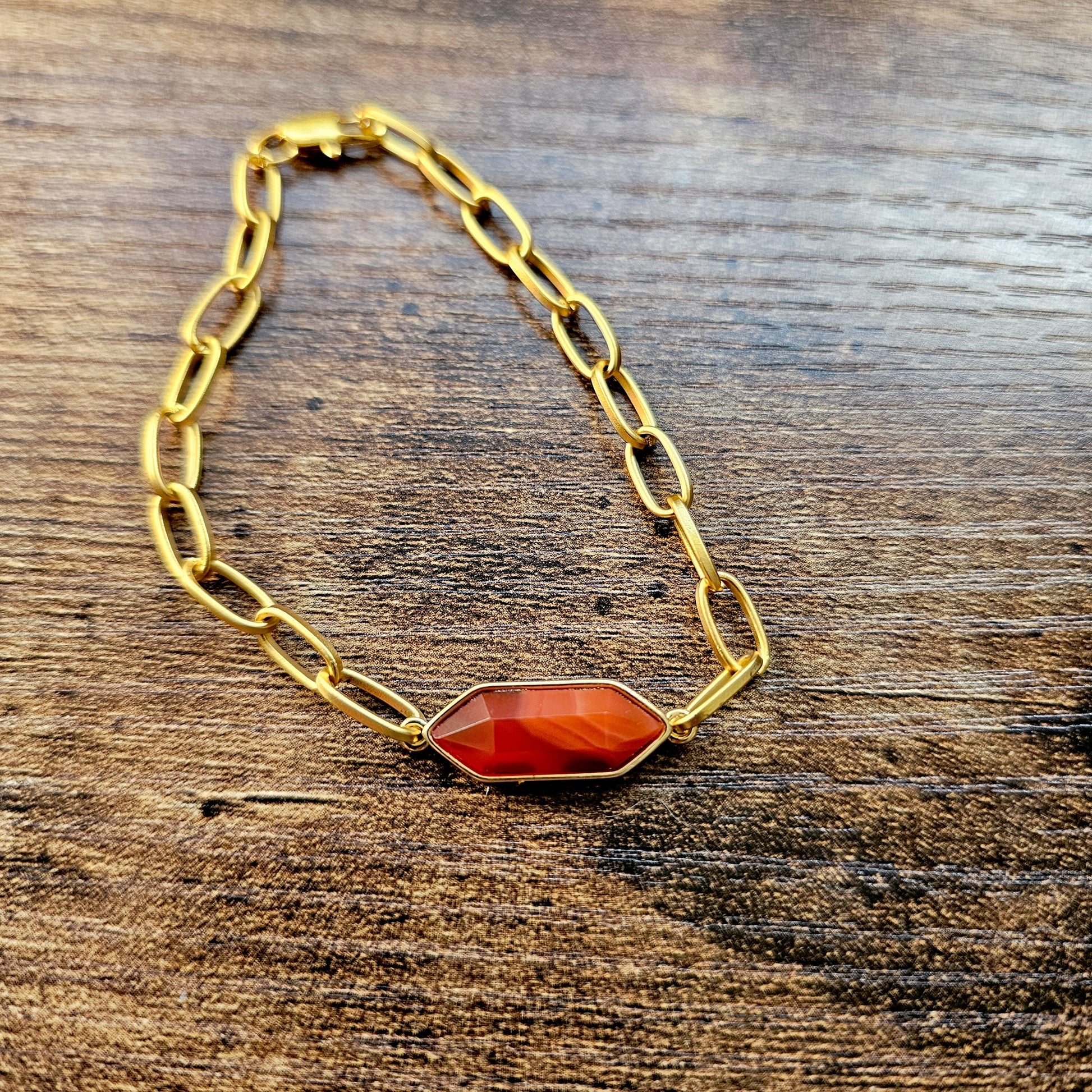 This beautiful carnelian 22kt Overlay Bracelet features a faceted stone that catches the light beautifully. The design is timeless elegance. The size is a comfortable standard 7.5-inch fit. Use for everyday wear or special occasions. It is definitely a versatile piece that brings both style and substance to your jewelry collection.