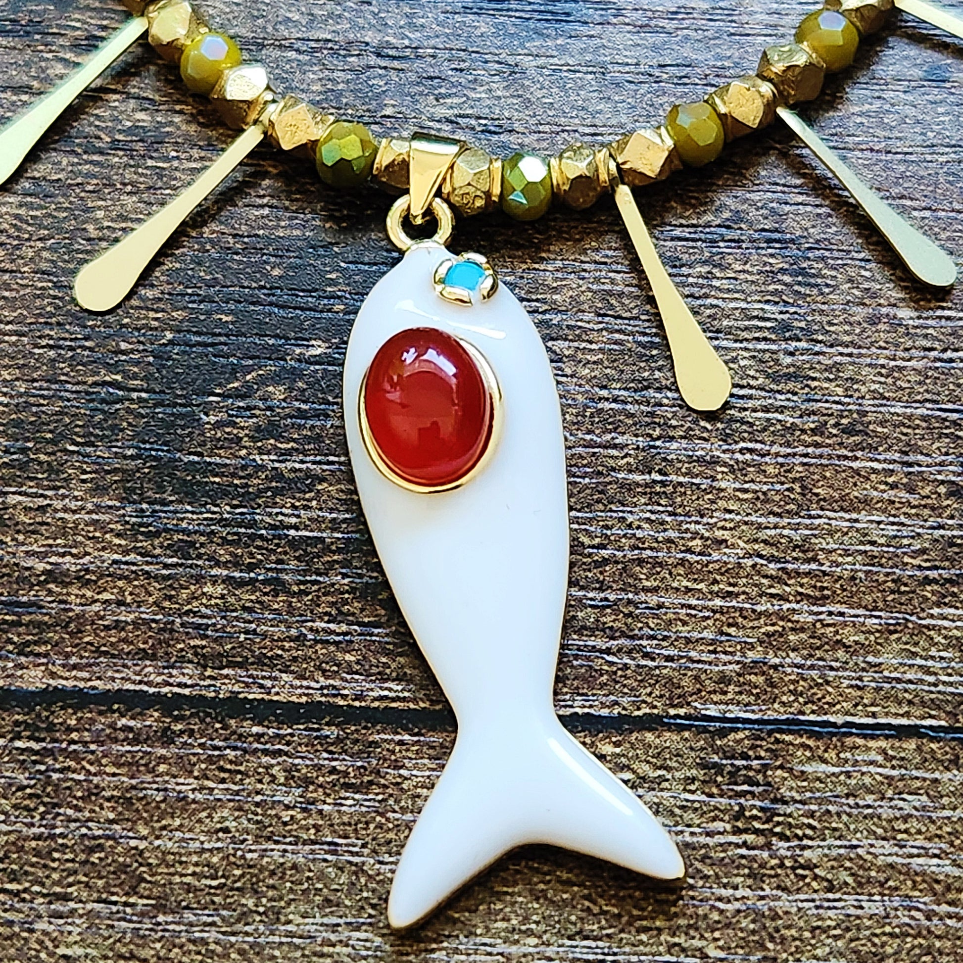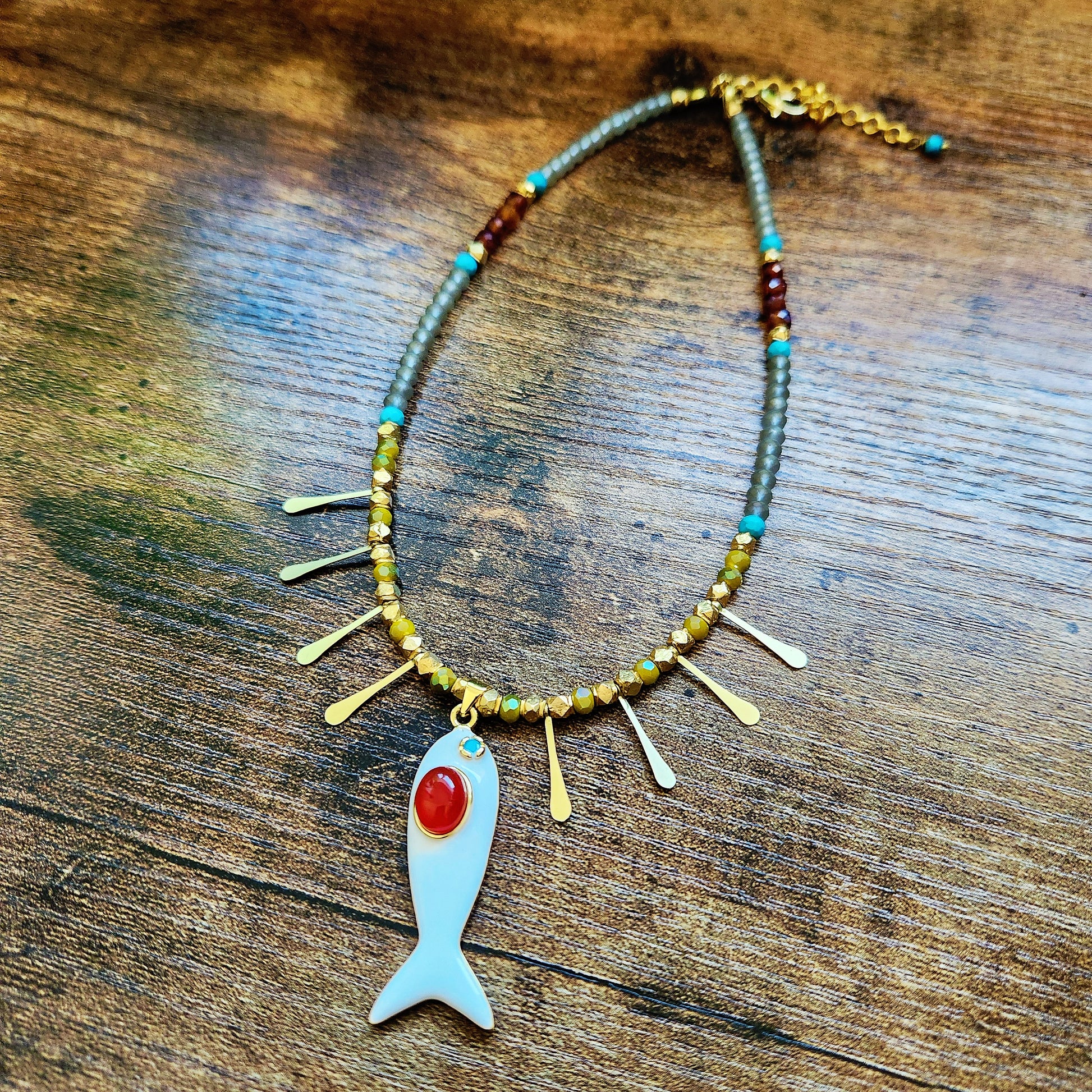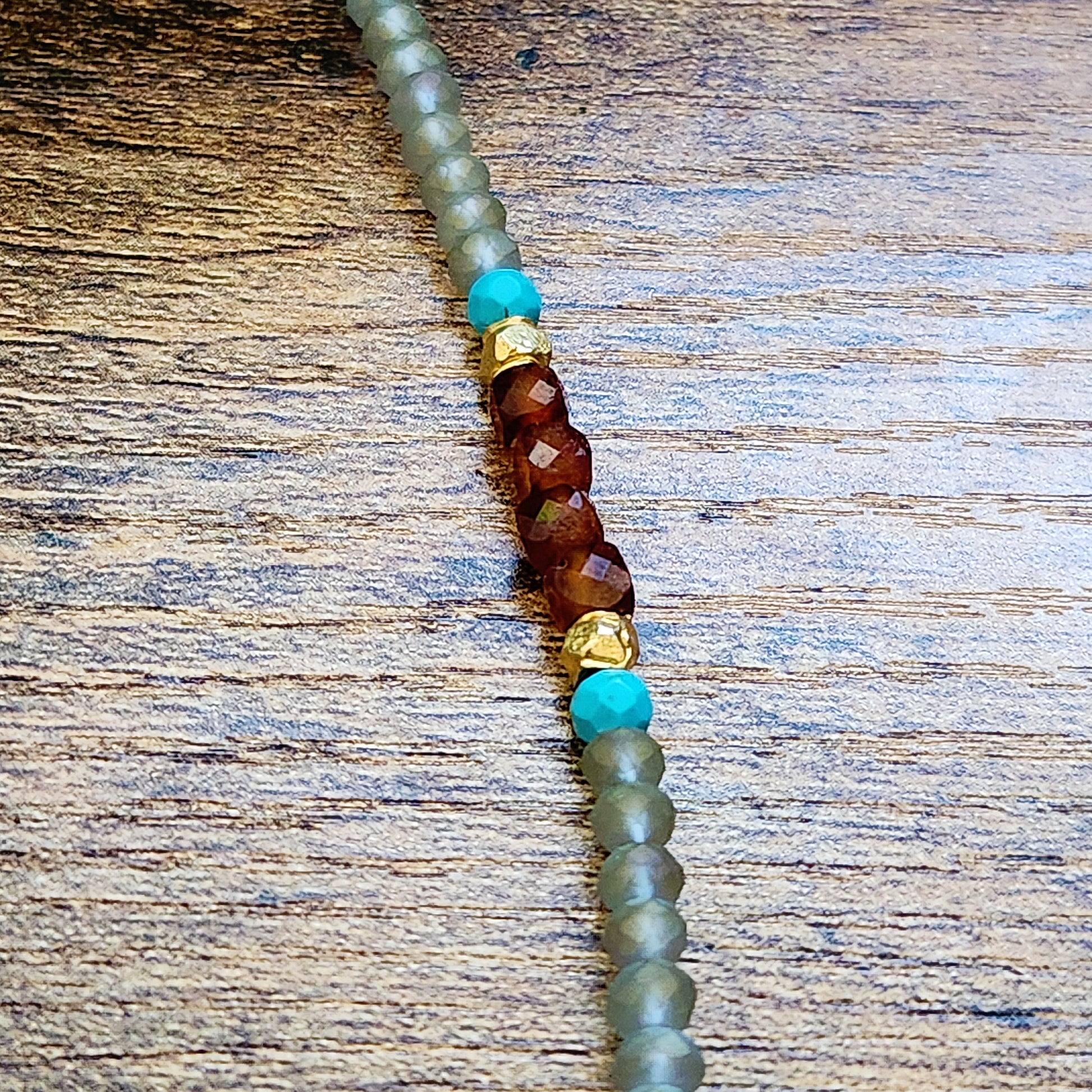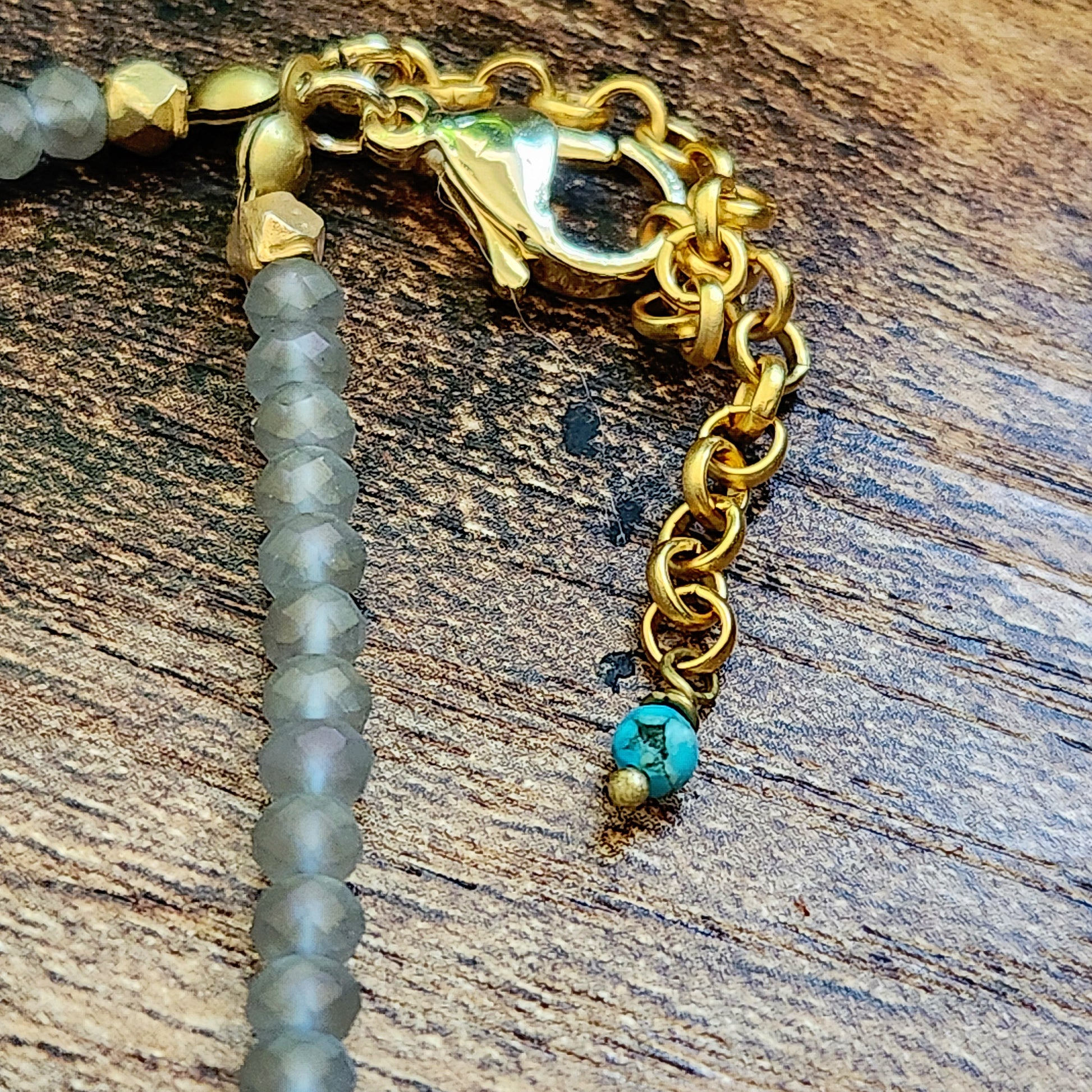This necklace features a sophisticated blend of beads in subtle grey to olive tones, complemented by raw faceted jade and vibrant turquoise accents. Designed with precision, it offers an adjustable length from 14 to 16 inches for a customized fit.