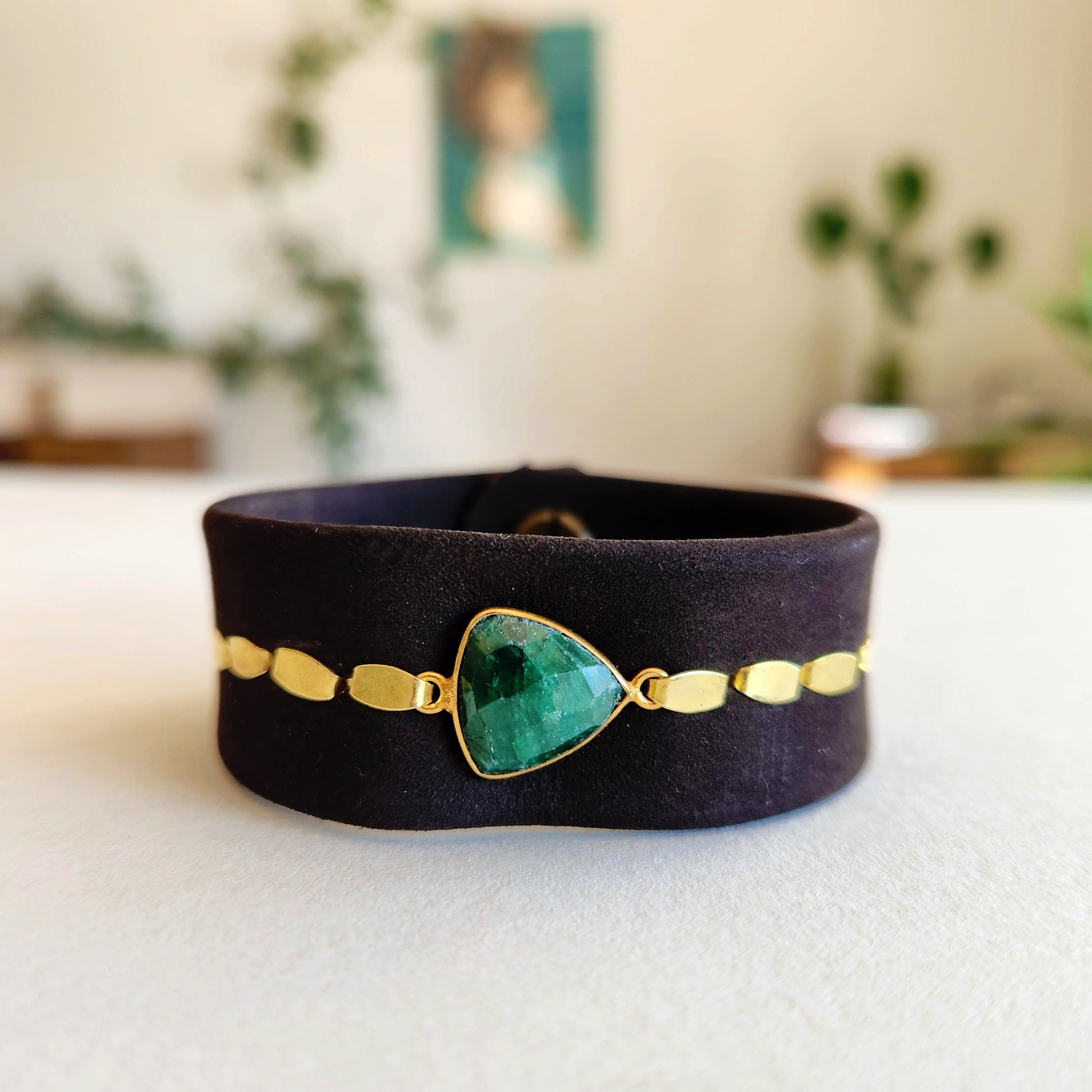 Crafted from soft leather, this cuff features a stunning faceted focal piece complemented by elegant brass elements. Designed for versatility, the cuff adjusts comfortably from 7.5 to 8 inches, ensuring a perfect fit. This blend of natural materials and refined metal accents creates a sophisticated accessory suitable for both everyday wear and special occasions.
