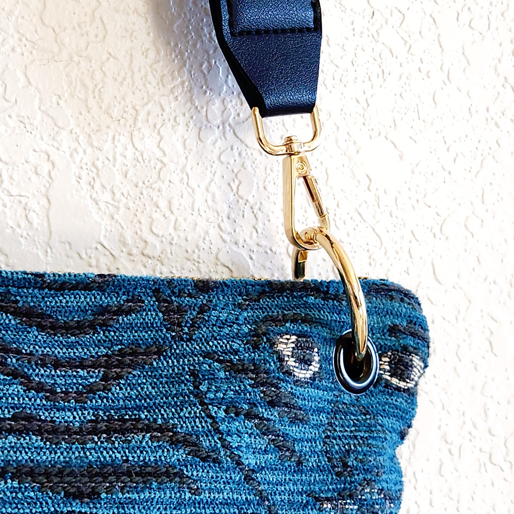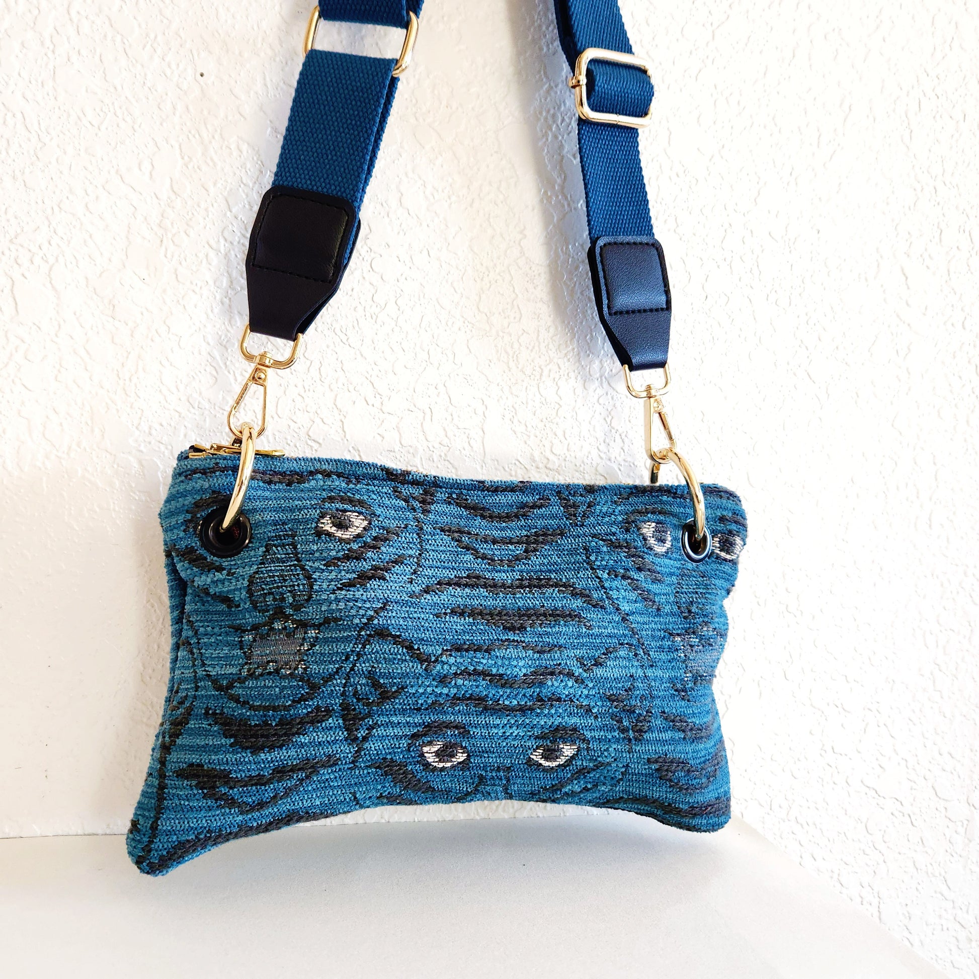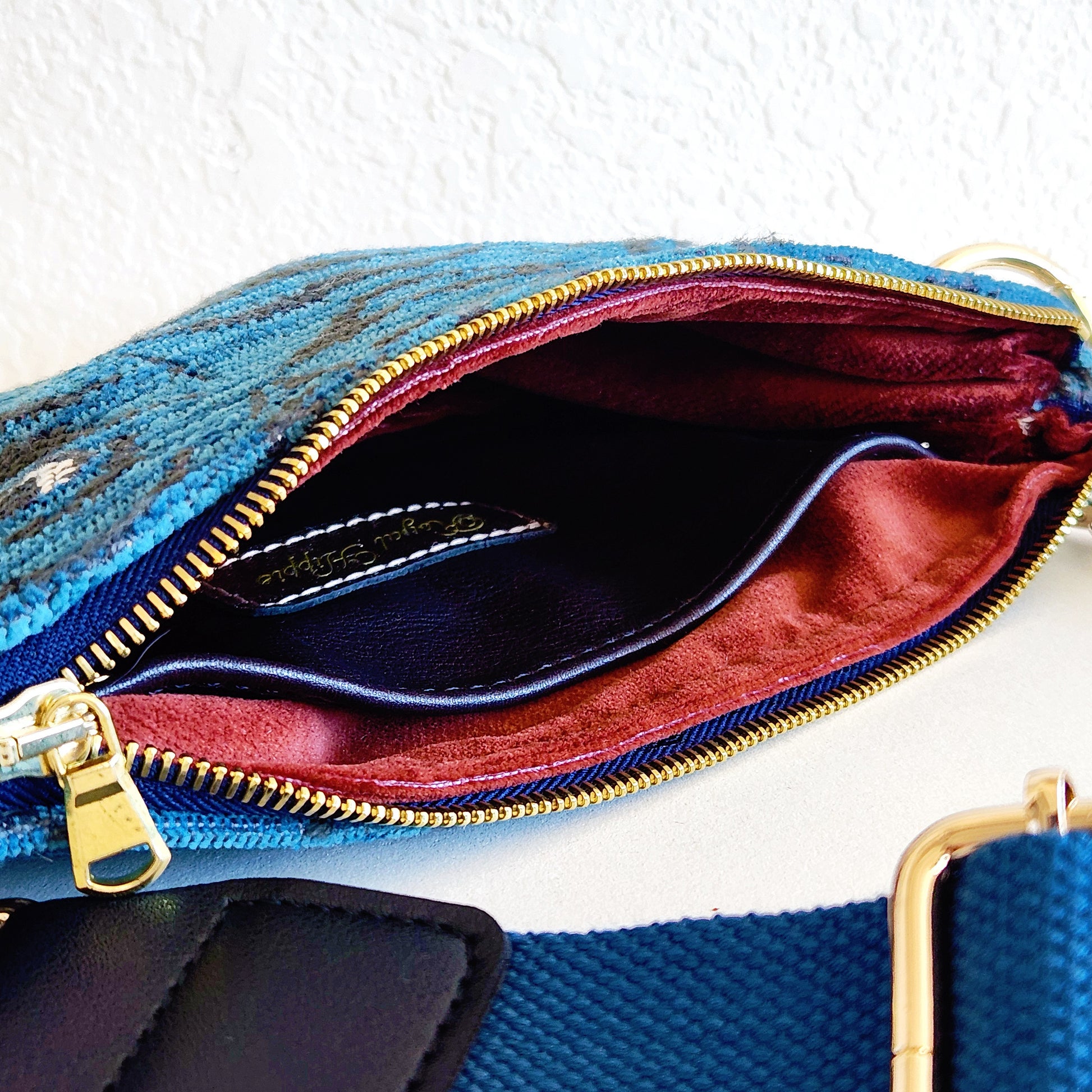 The Cobalt Velvet Bengal Crossbody is meticulously slow c handcrafted in the USA, featuring a rich rust velvet lining and a large interior pocket for organized storage. Its canvas adjustable strap with swivel hardware ensures a comfortable, customizable fit, while the heavy-duty Italian zipper guarantees durability and secure closure. This crossbody blends expert craftsmanship with practical design for everyday elegance.