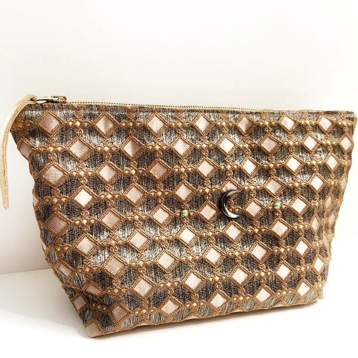 Expertly crafted from the highest quality cream and pewter hues, this Moon Traveller Bag Med features an embroidered gold accent for a touch of luxury. Lined with soft velvet in a soothing slate blue shade, it also boasts a durable Italian zipper and a gunmetal crescent moon with vintage green accents. Perfect for travel or as a chic make-up bag. 6" H x 10.75 W x 5" D Metal Zipper closure * Made in the USA