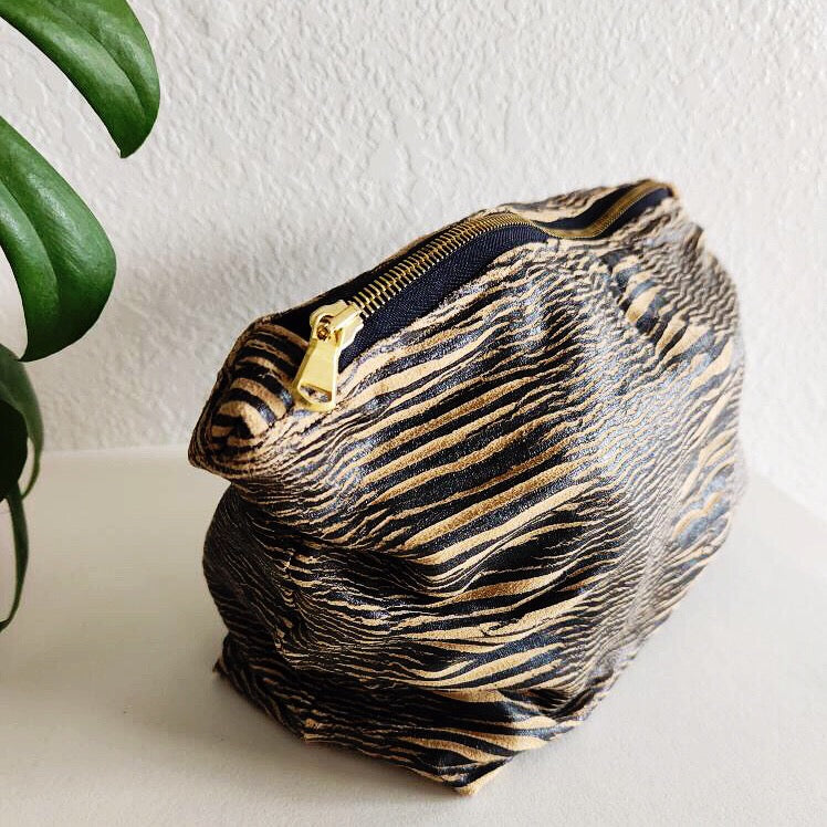Amazing black and tan fabric with distressed stripes. Fully lined with chartreuse plush velvet. This is the perfect size for all of your cosmetic and travel needs. * Velvet Lining * Dimensions Approximately 6" H x 10.75 W x 5" D * Metal Zipper closure * Made in the USA