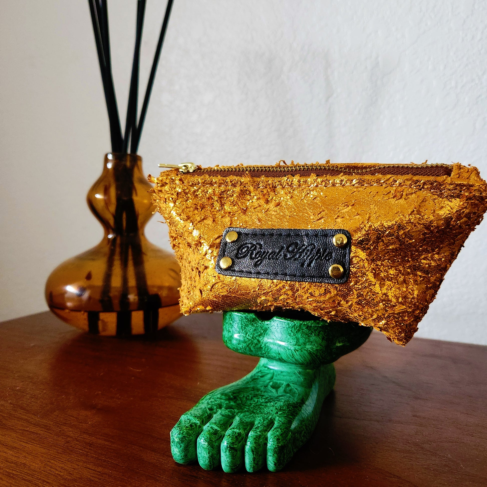This Distressed Copper Mini Pouch features metallic leather for a sleek, stylish look. The metal zipper ensures secure closure, while the velvet-lined interior protects your belongings. Make a statement with this unique, chic accessory.