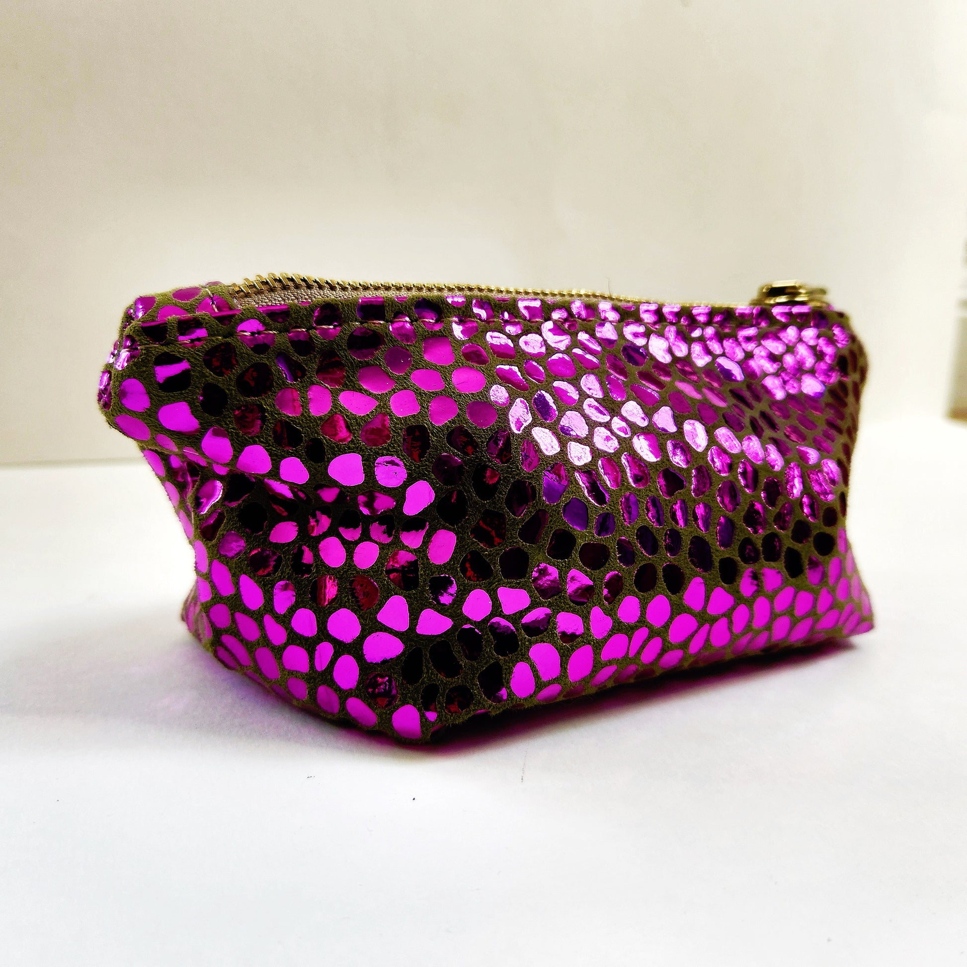 This Fushia Mini Pouch with its sleek metallic design features an Italian zipper for added durability. Its velvet-lined interior offers a luxurious touch and protects your belongings. With its compact size and stylish appearance, this pouch is perfect for on-the-go organization and storage.