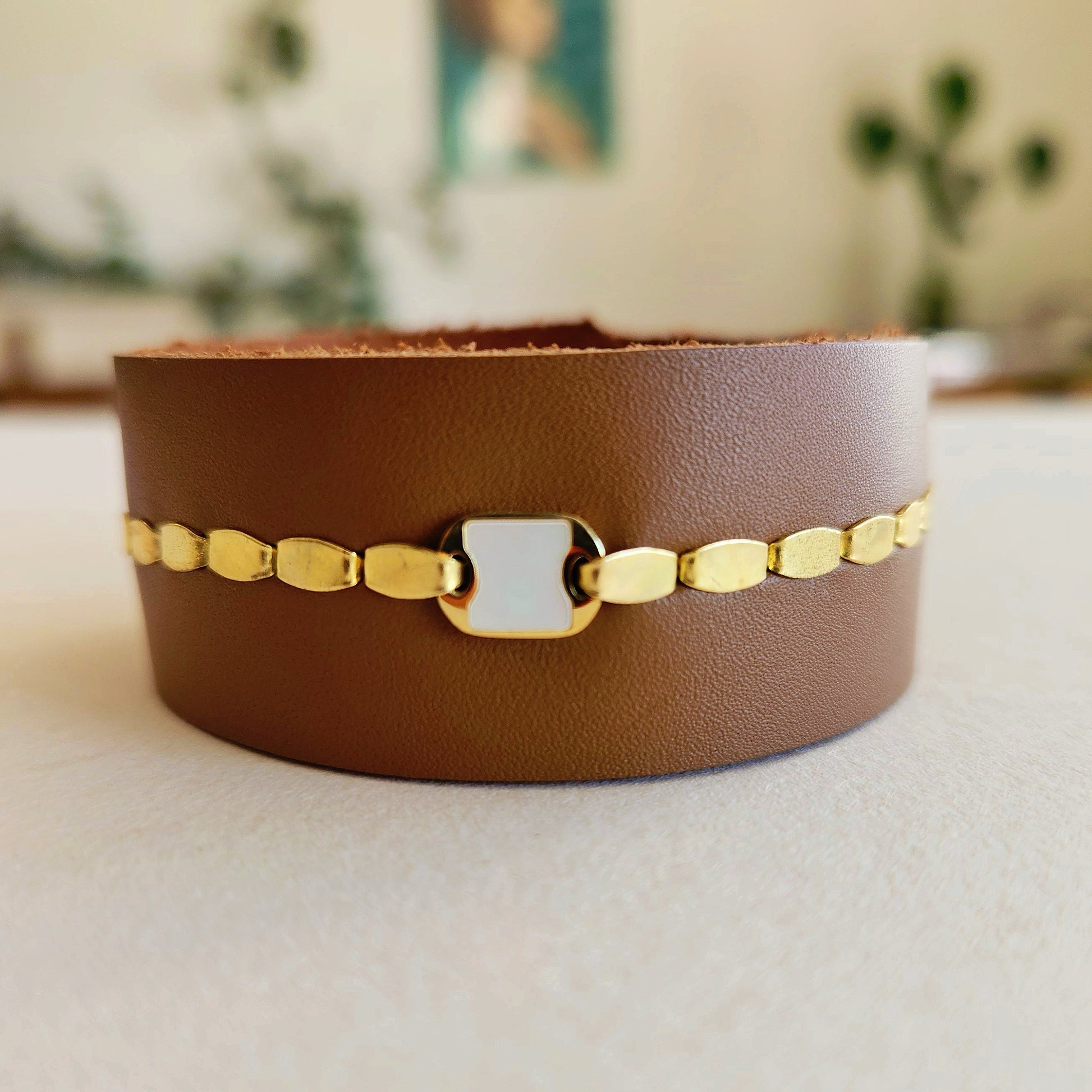 Crafted from soft leather, this tan cuff features a stunning goldfilled mother-of-pearl focal piece complemented with elegant brass elements. Designed for versatility, the cuff adjusts comfortably from 7.5 to 8 inches, ensuring a perfect fit. This blend of natural materials and refined metal accents creates a sophisticated accessory suitable for both everyday wear and special occasions.