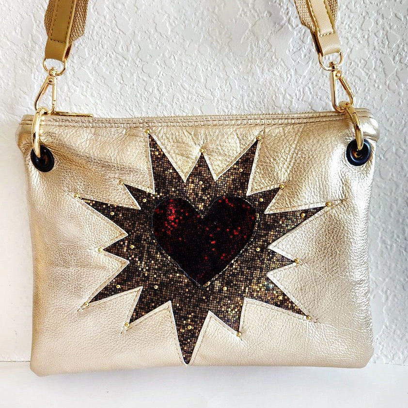 Expertly crafted with supple metallic gold leather, the Gold Mon Coeur Crossbody Bag features an artisan heart focal and plush velvet lining. Stay organized with the convenient small inside pocket and adjust the canvas strap to your liking with swivel hardware. Elevate your style with this luxurious and versatile accessory. Handcrafted with care in the USA. Dimensions approximately 8" H x 10.75" W.
