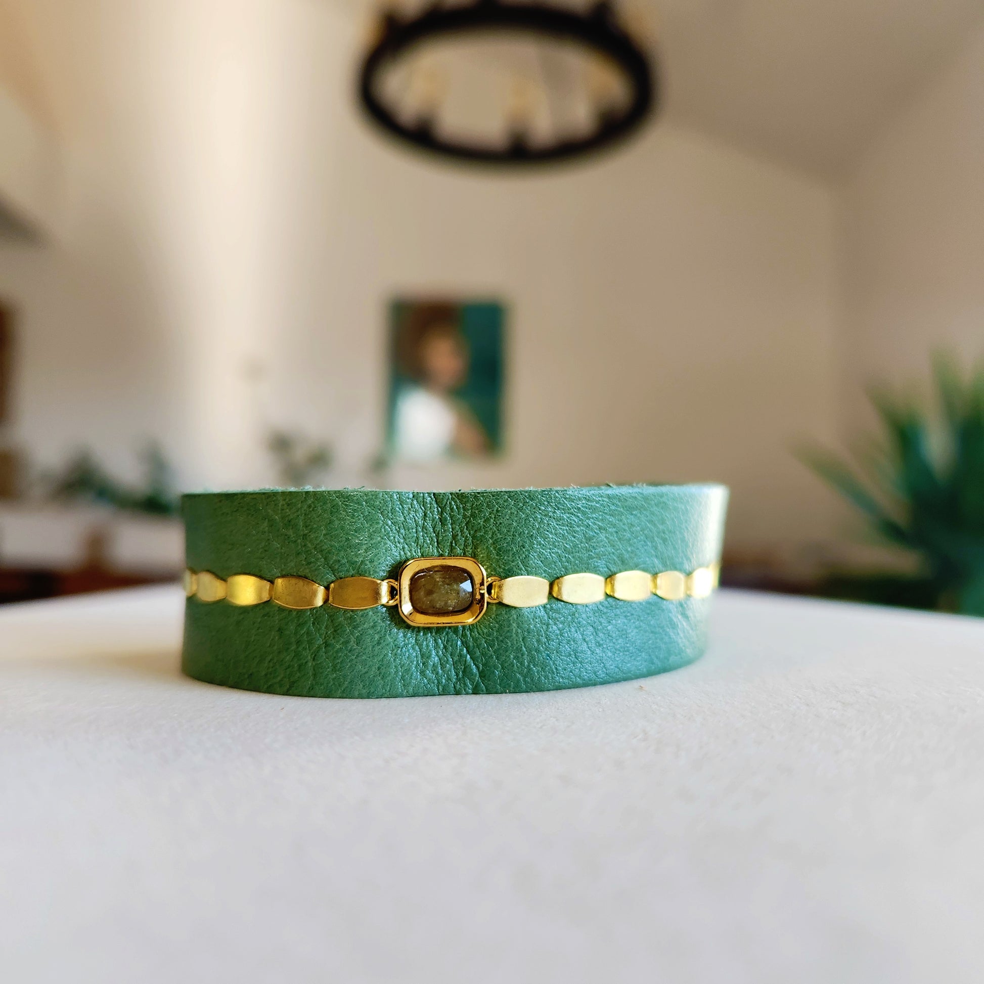 This supple green cuff features a striking faceted stone centerpiece, set in 22kt gold overlay for a rich, elegant finish. The adjustable design fits from 7.5 to 8 inches. It's handcrafted, combining artisanal craftsmanship with versatility for everyday wear or special occasions. Ideal for those who appreciate finely detailed and durable jewelry.