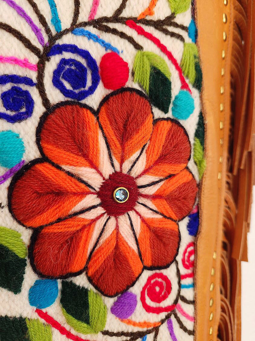 he finest leather is used for these tote. Buttery soft and vibrant handcrafted hand stitched floral pattern. The embroidery is from Peru and the group of ladies creating these are 100% fair trade. The bag is fully lined with an extra large outer pocket and it also has a medium sized inner pocket. The fringe is hand cut and adorned with gold rivets. It's absolutely stunning. * Cotton Lining * Magnetic Snap Closure * Approximately 14" H x 14" W * Made in USA and Peru