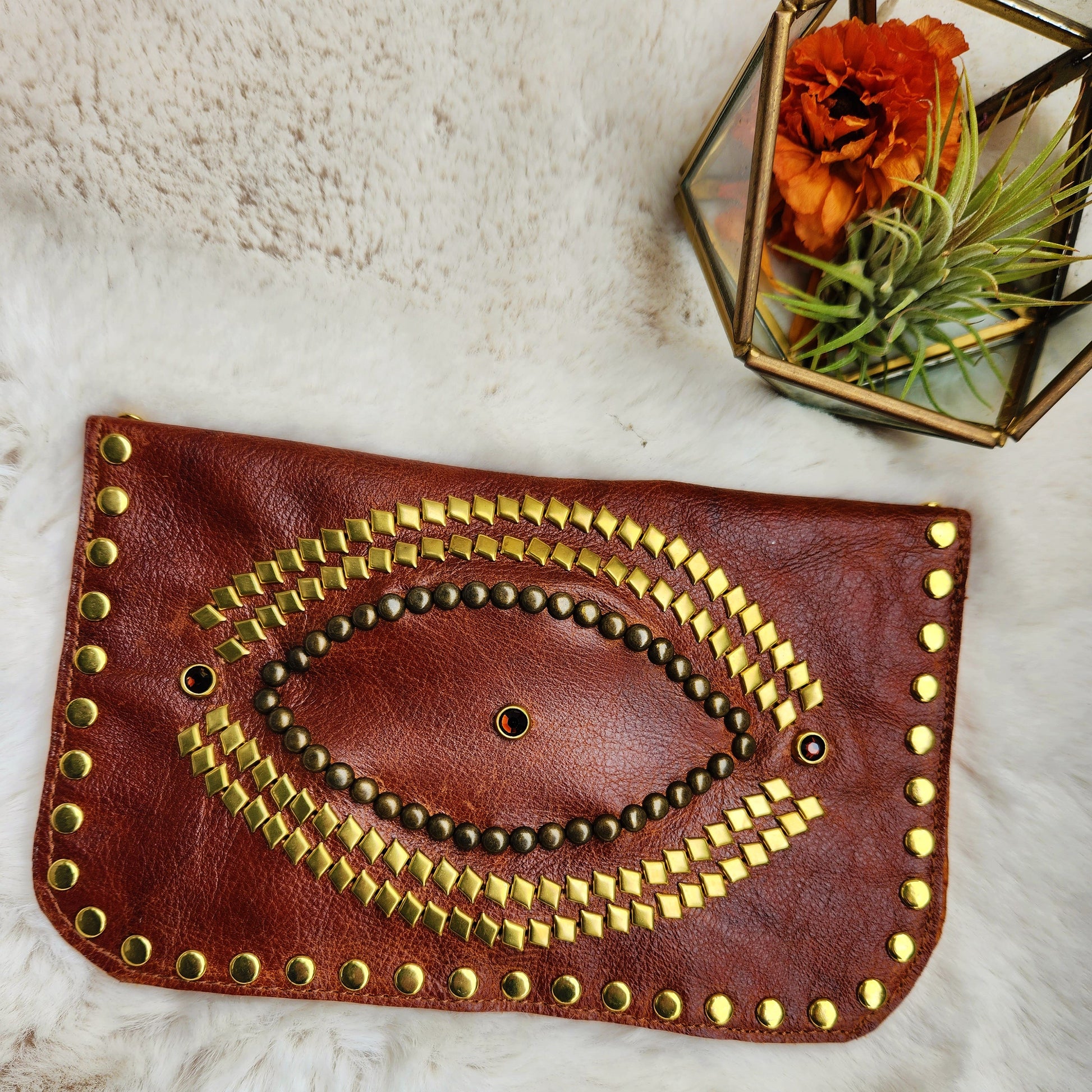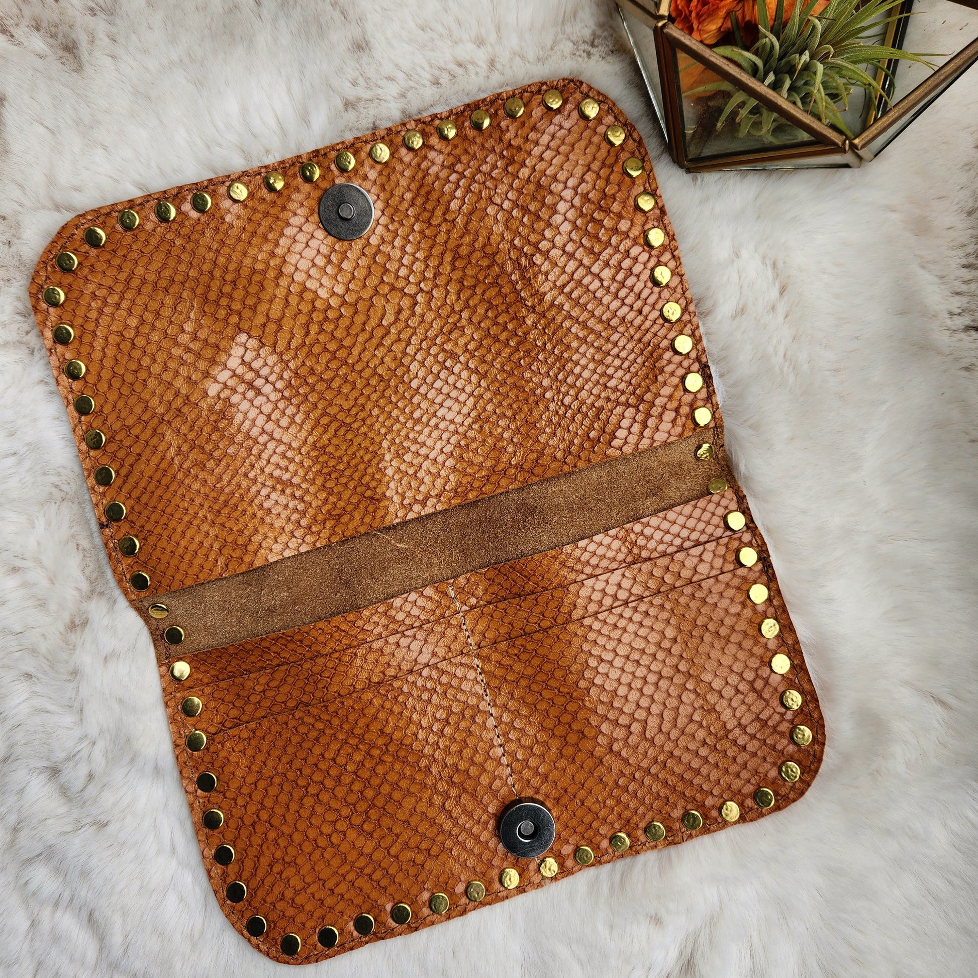 Supple sable brown Italian leather with beautiful hand designed embellishments. It has 6 card slots and a larger slot big enough for phone and passport an a magnetic snap closure. Decorative brass and crystal are the main focal and this wallet will only get more beautiful with aged use. Absolutely unique in its design and no 2 are ever alike. Heavy duty metal magnetic closure. Dimensions Approximately 5"H x 8" W *Made in the USA*