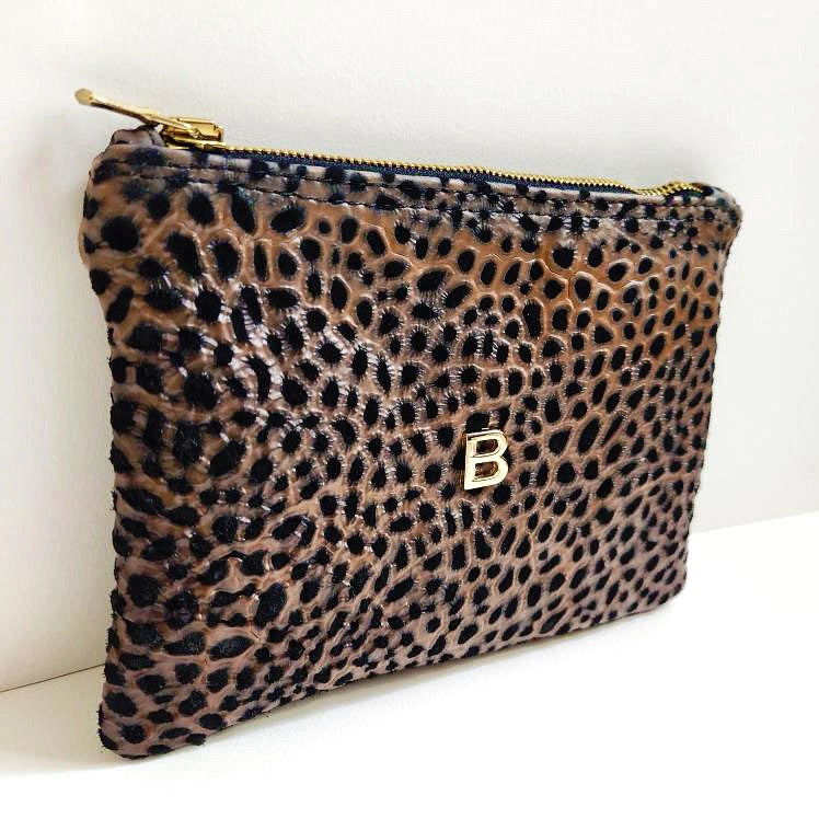 This incredible leather is made with a technic that is well know in the Tuscany region. Crafted in the USA, this pouch combines elegance and functionality. Sporting a cheetah pattern, it adds a touch of wild sophistication, while the luxurious velvet lining and high-quality Italian zipper offer both style and security. The internal pocket allows easy access to all your card essentials. Dimensions: 7.75" W x 6" H. These leathers are recused in the heart of Italy's designer fashion region.