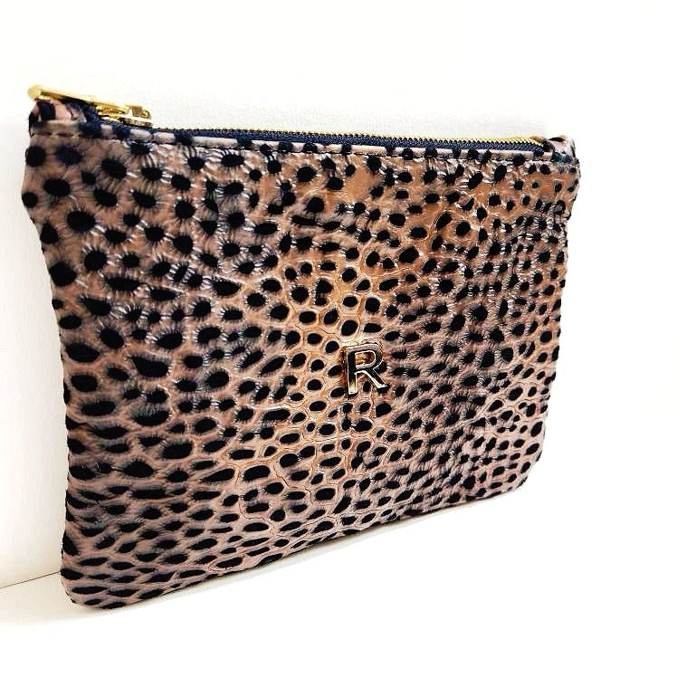 This incredible leather is made with a technic that is well know in the Tuscany region. Crafted in the USA, this pouch combines elegance and functionality. Sporting a cheetah pattern, it adds a touch of wild sophistication, while the luxurious velvet lining and high-quality Italian zipper offer both style and security. The internal pocket allows easy access to all your card essentials. Dimensions: 7.75" W x 6" H. These leathers are recused in the heart of Italy's designer fashion region.