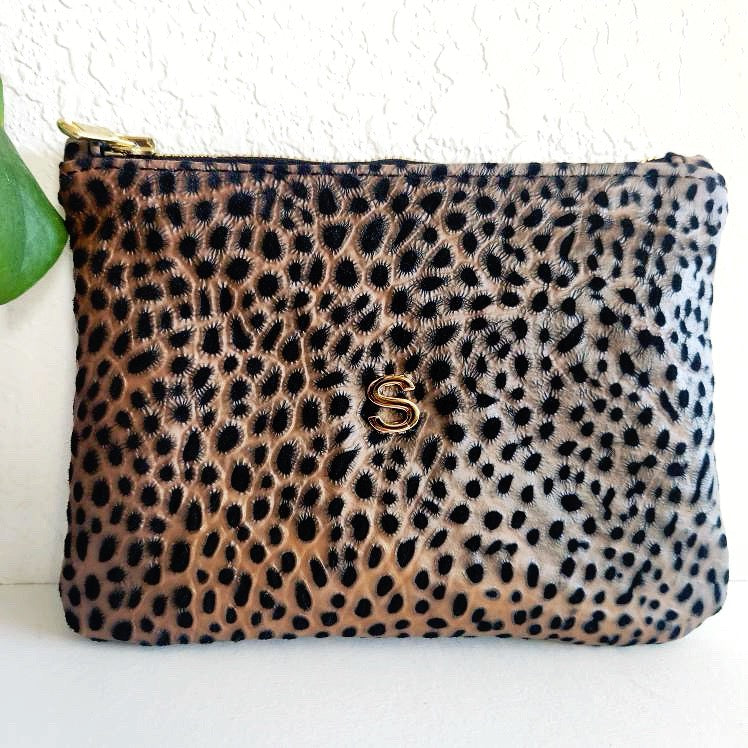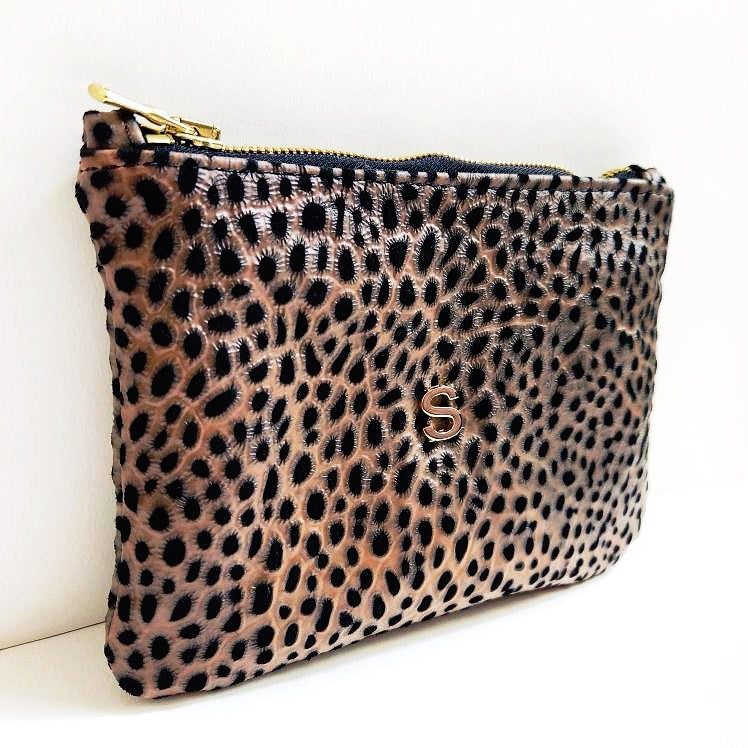 This incredible leather is made with a technic that is well know in the Tuscany region. Crafted in the USA, this pouch combines elegance and functionality. Sporting a cheetah pattern, it adds a touch of wild sophistication, while the luxurious velvet lining and high-quality Italian zipper offer both style and security. The internal pocket allows easy access to all your card essentials. Dimensions: 7.75" W x 6" H. These leathers are recused in the heart of Italy's designer fashion region.