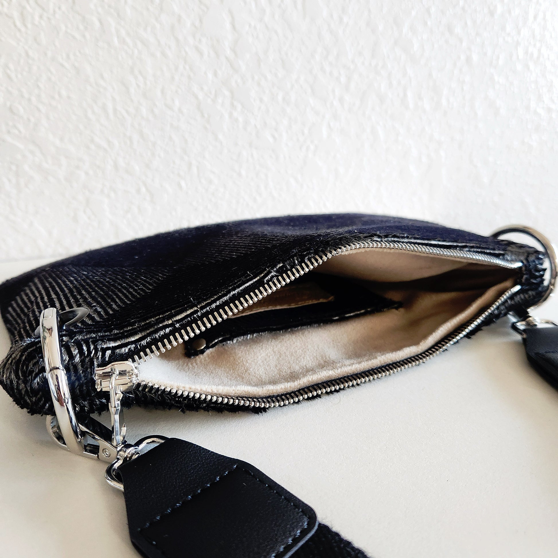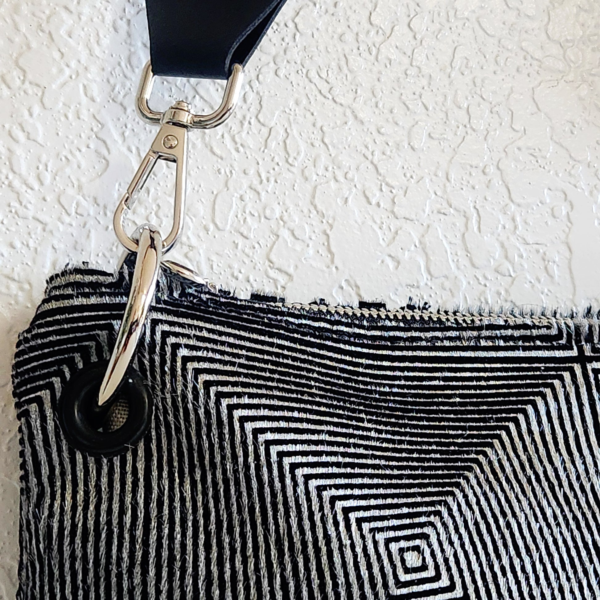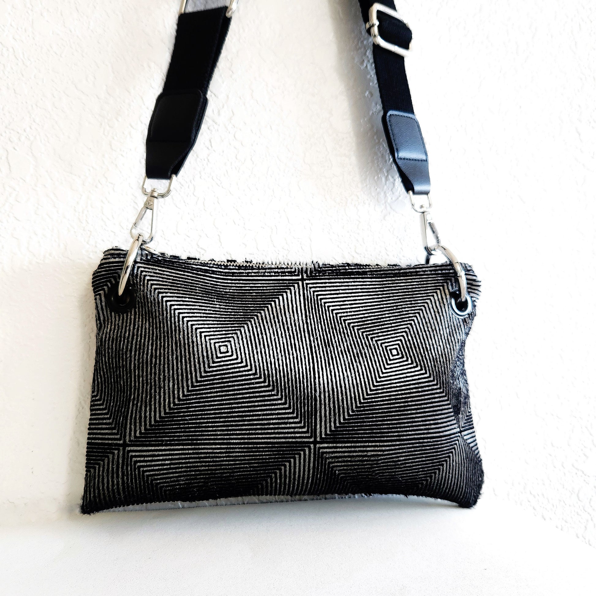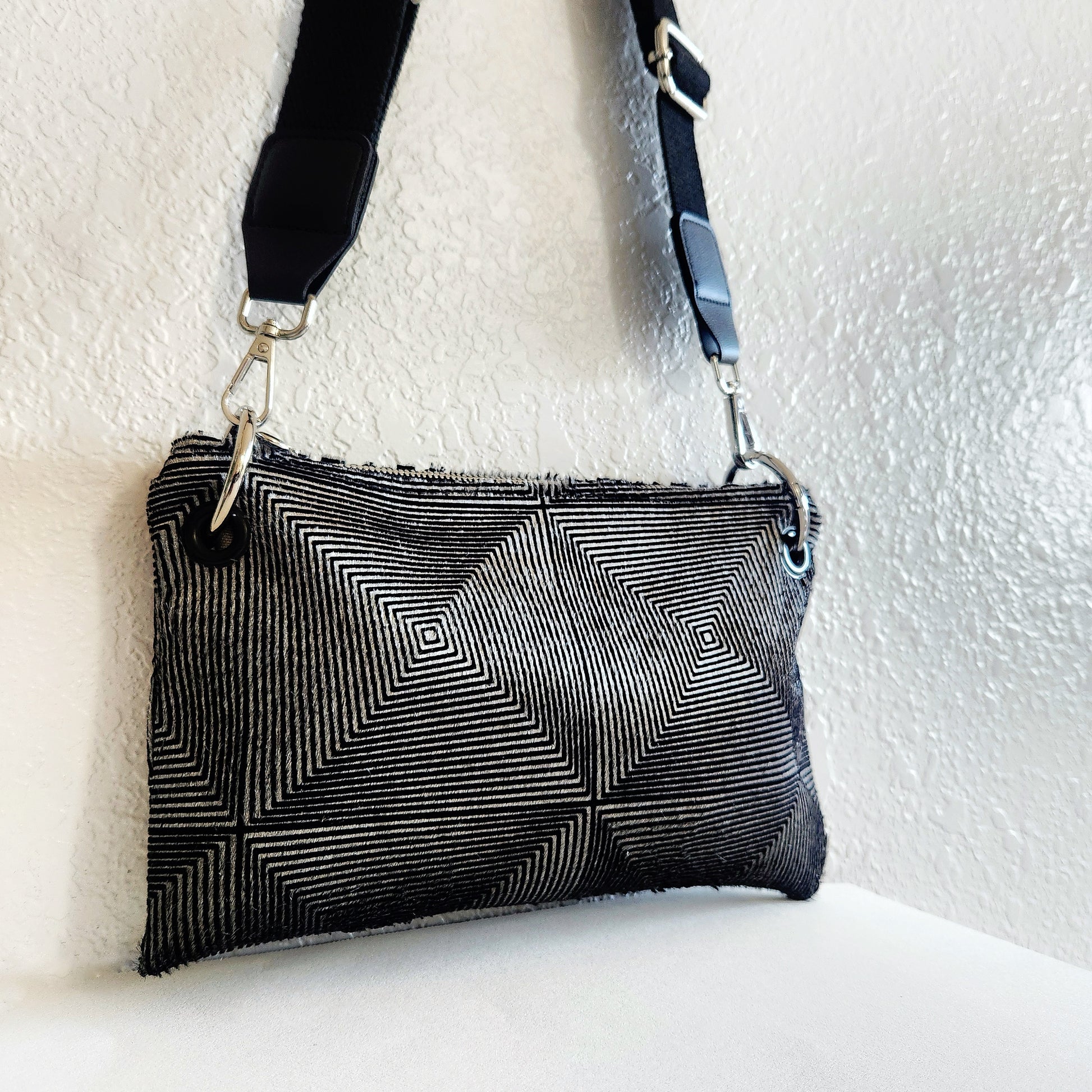What a beautiful optical illusion crossbody Bag. Featuring a stunning design on luxurious hair-on Italian leather, this bag is a true statement piece. Enhance your style and add a touch of sophistication to any outfit. Dimensions approximately 7" H x 10" W, with a 12" canvas adjustable shoulder strap. Handcrafted in the USA