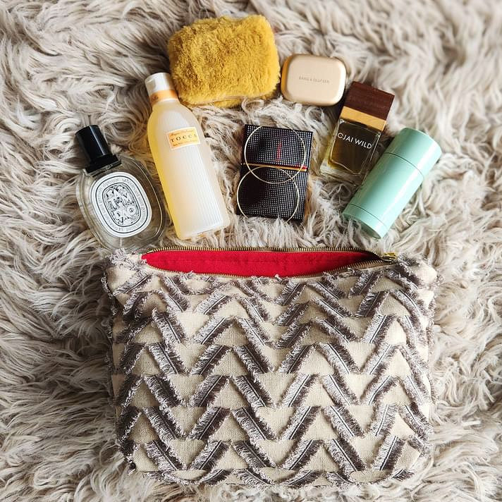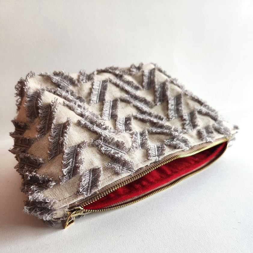 Experience luxury and style with the Linen Fringe Traveller Medium. This travel bag features a cream and grey outer, plush red velvet interior, and a brass Italian zipper. Made in the USA, it measures approximately 9" H x 12 W x 6" D * Keep your belongings secure with its metal zipper closure.