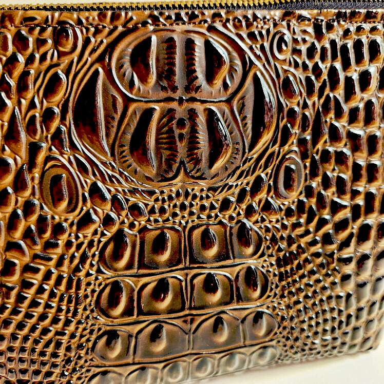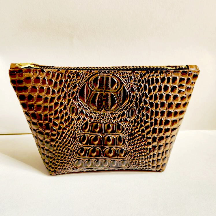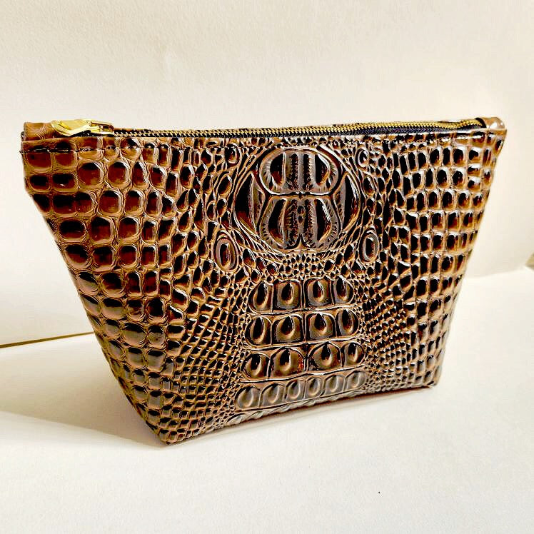 Carry your essentials in style with the Mocha Faux Croc Traveller Medium. This chic travel bag has a deep mocha color, and is luxuriously lined with silk velvet for a timeless touch. Perfect to take on the go, this luxurious bag is the perfect choice for any fashionable traveler. * Velvet Lining * Dimensions Approximately 6" H x 10.75 W x 5" D Metal Zipper closure * Made in the USA