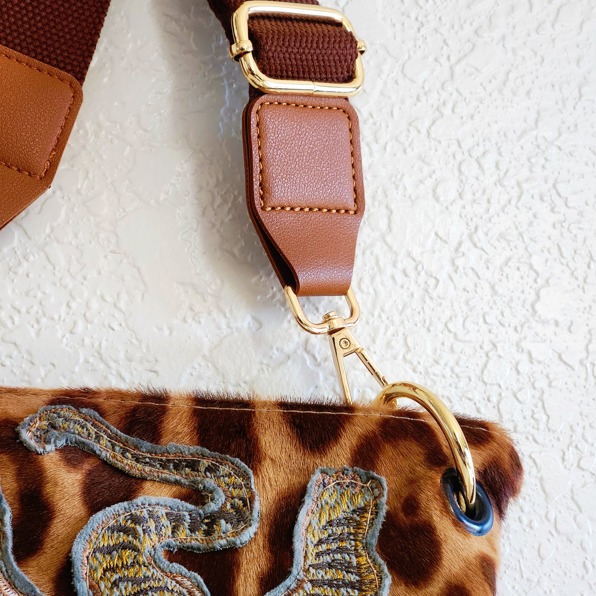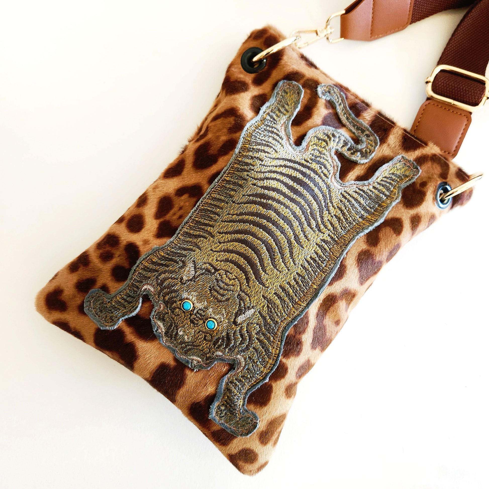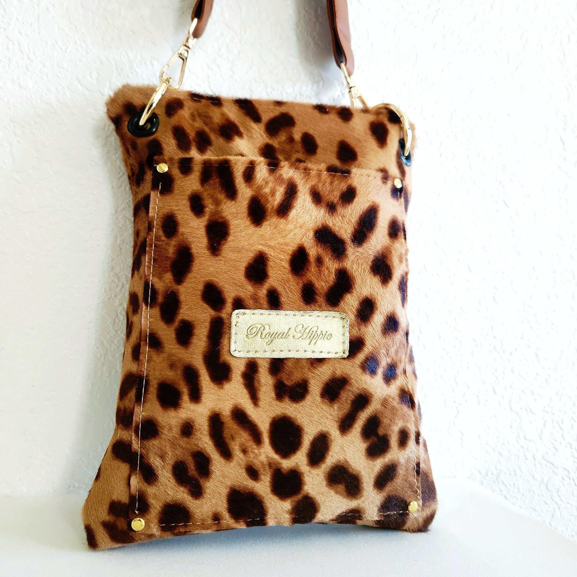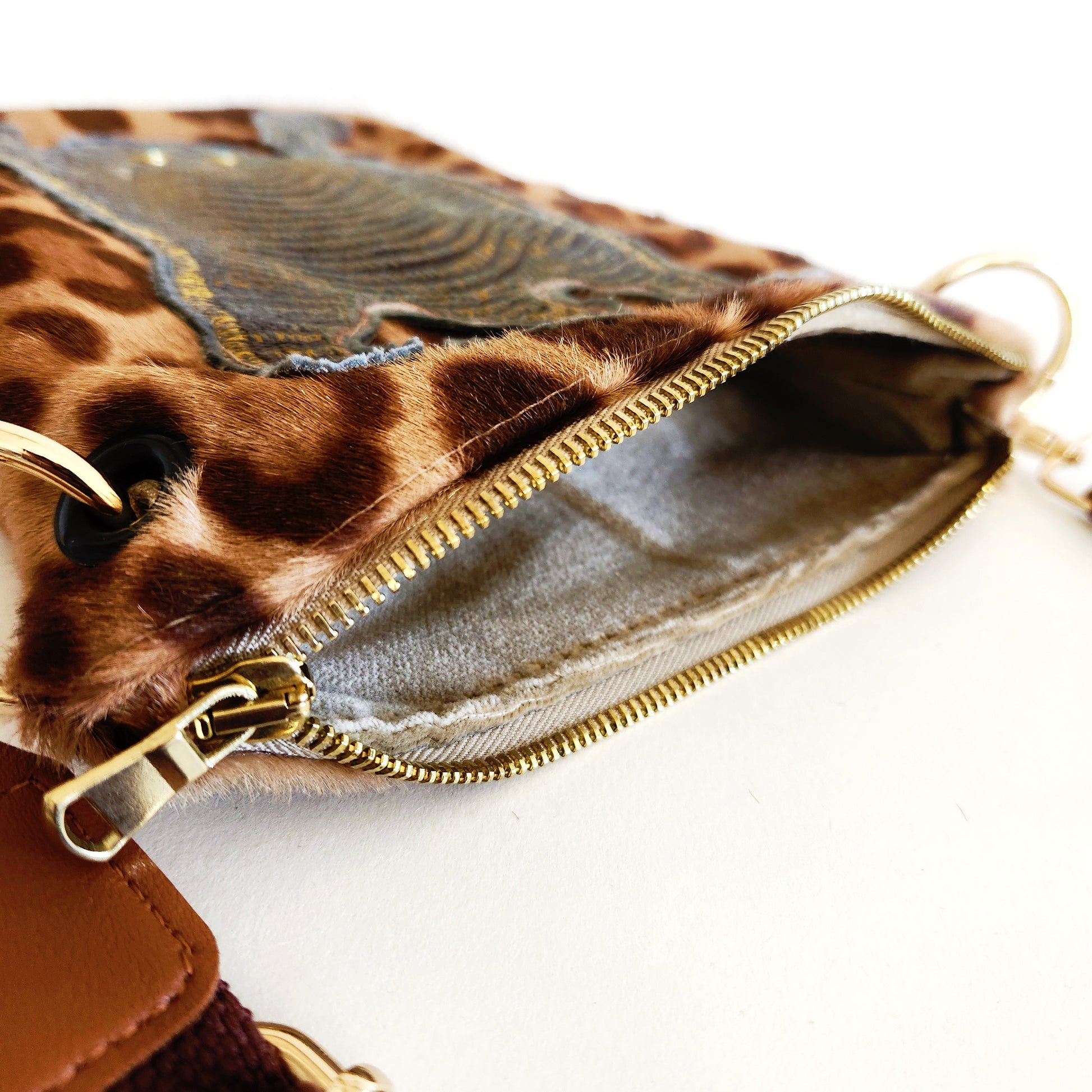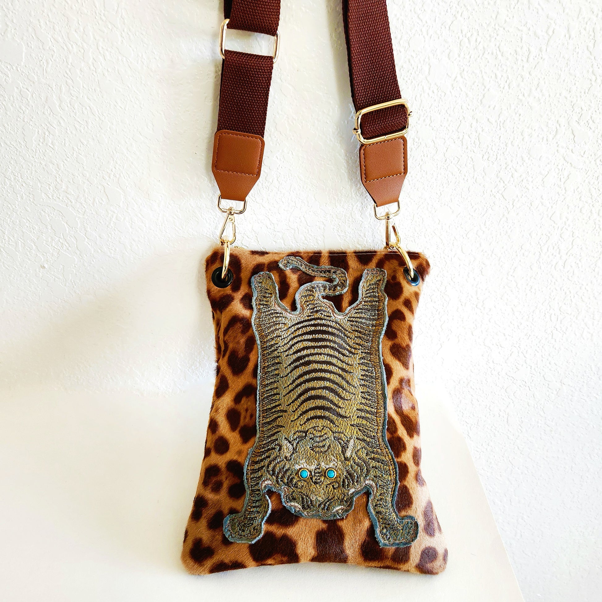 Crafted from beautiful hair-on Italian leather, the Mocha Leopard Bengal Crossbody Bag features striking turquoise accents that add a vibrant touch. Designed for practicality, it includes a larger outside pocket for easy access to essentials and an adjustable canvas strap for comfortable, customizable wear. This expertly made bag combines luxury materials with functional design, perfect for those seeking both style and convenience.