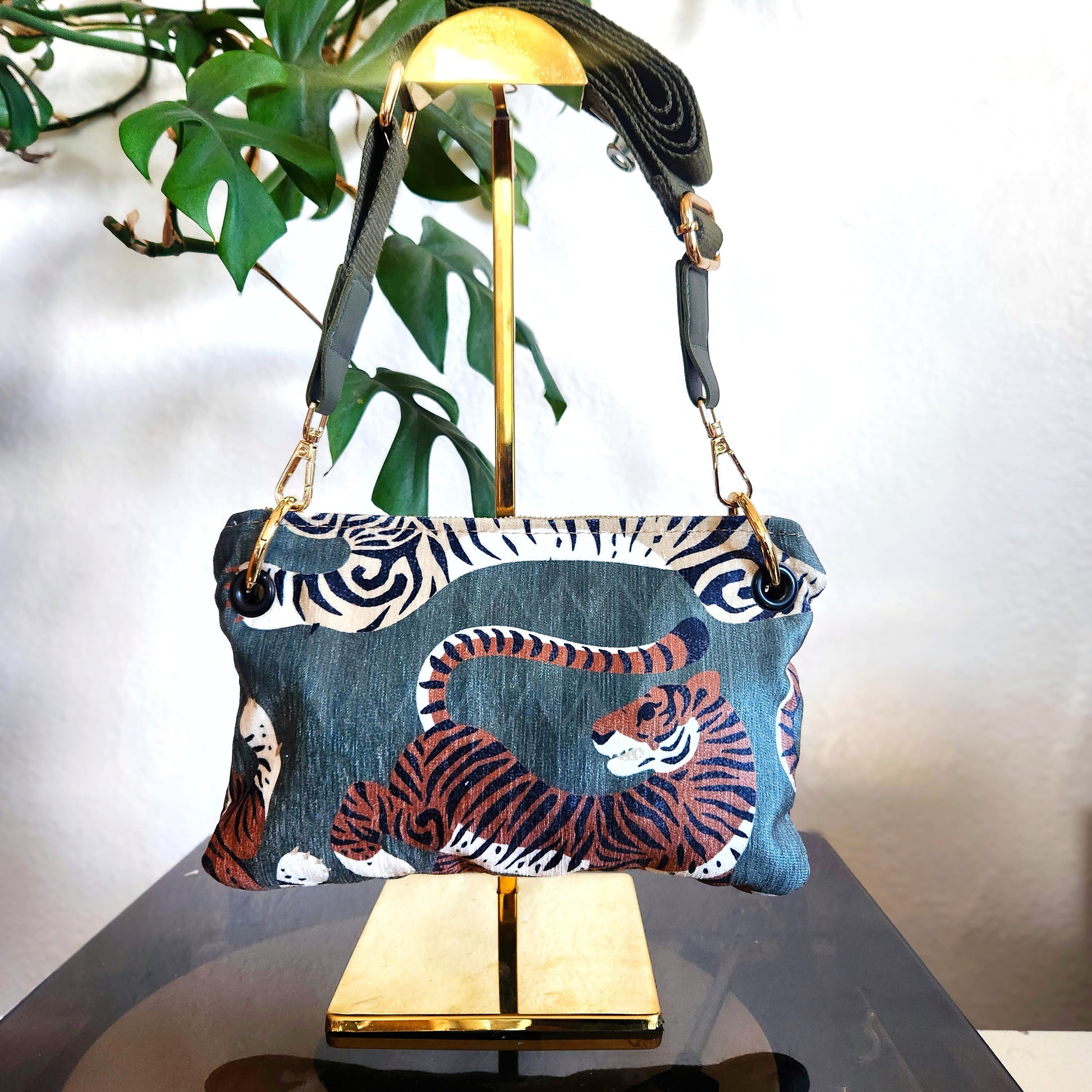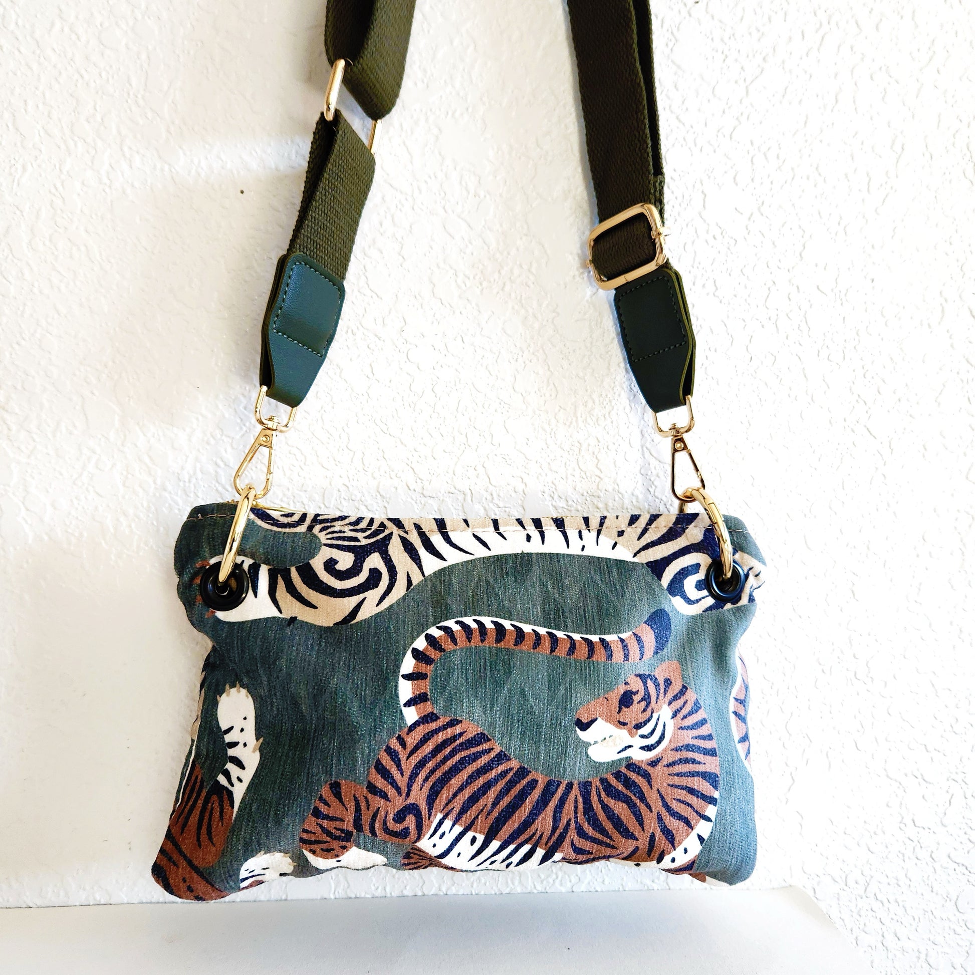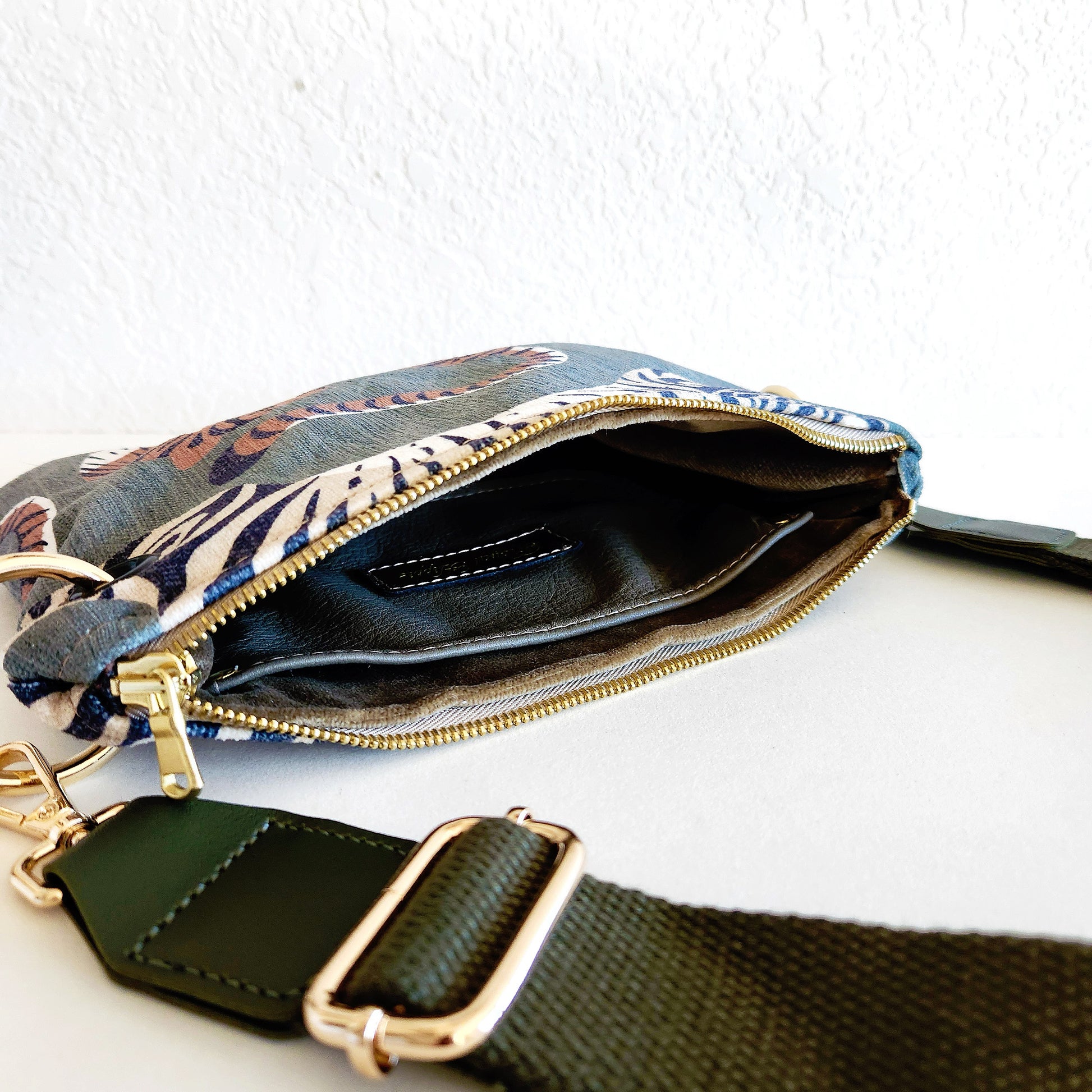 The Moss Velvet Tiger Crossbody Bag combines slow-crafted quality with practical design. Its velvet-lined interior offers a luxurious feel, while the adjustable canvas strap ensures comfort.. Featuring a large inside pocket and secured with a heavy-duty Italian zipper, this bag provides both ample storage and reliable durability, making it a great choice for those seeking style and functionality.