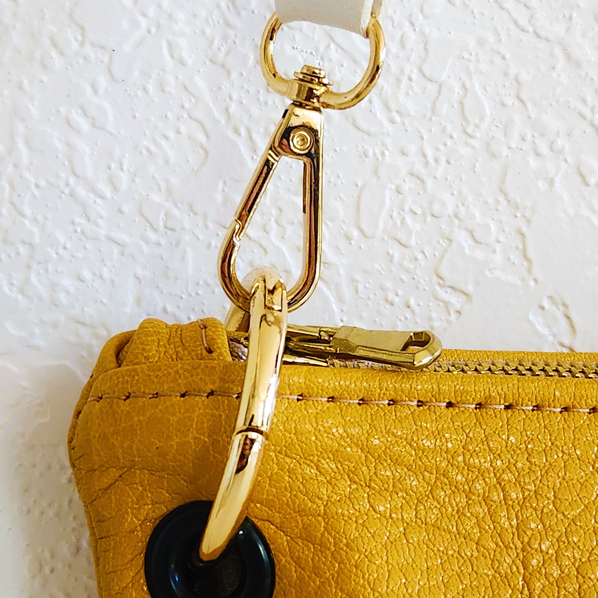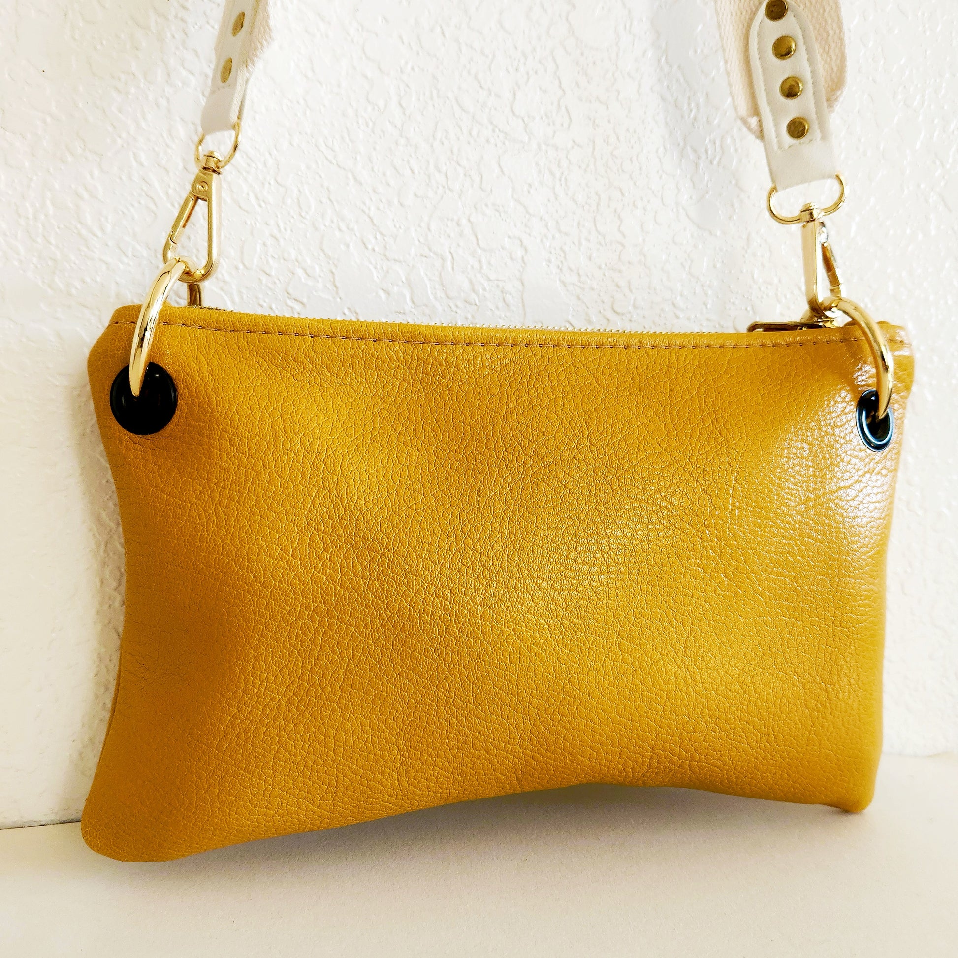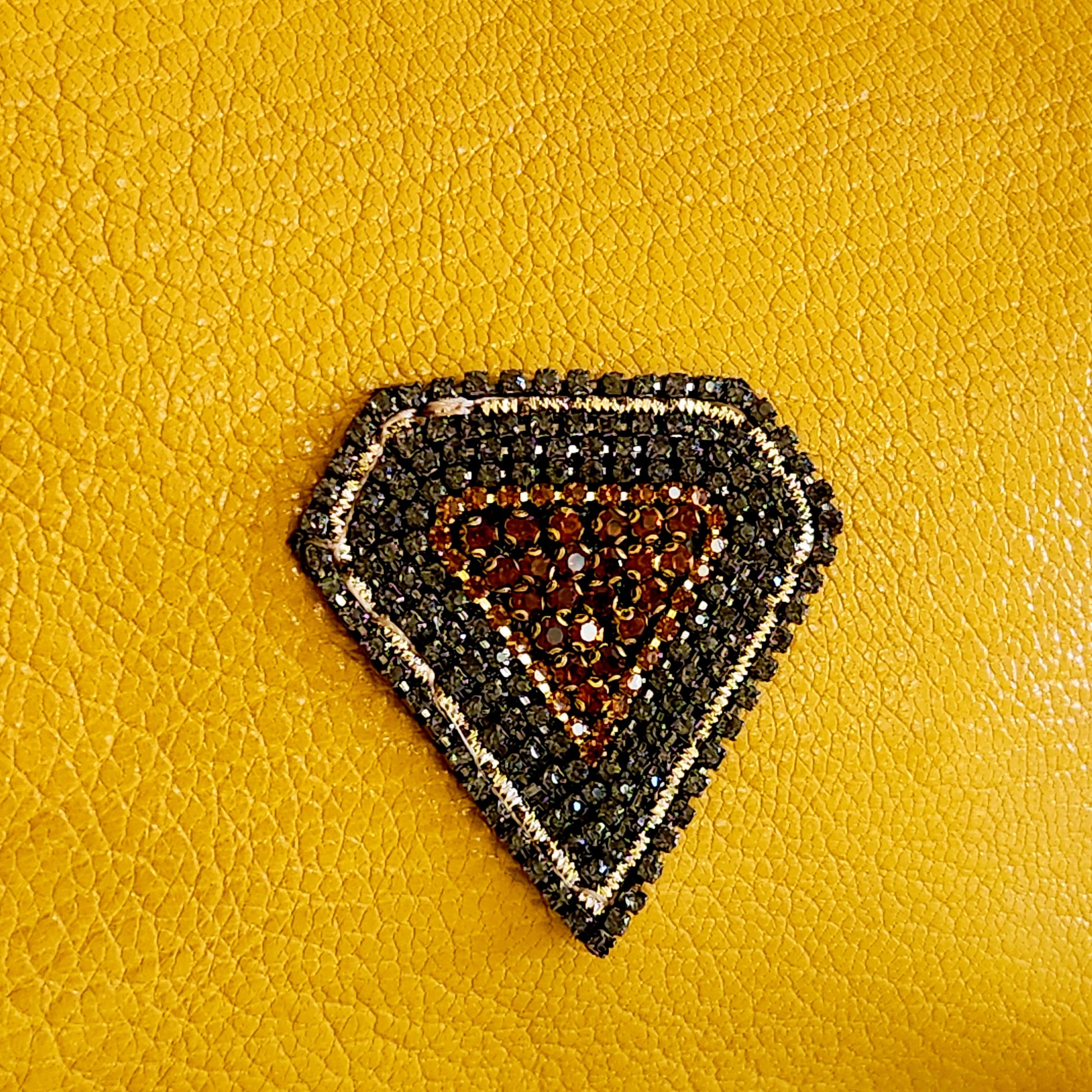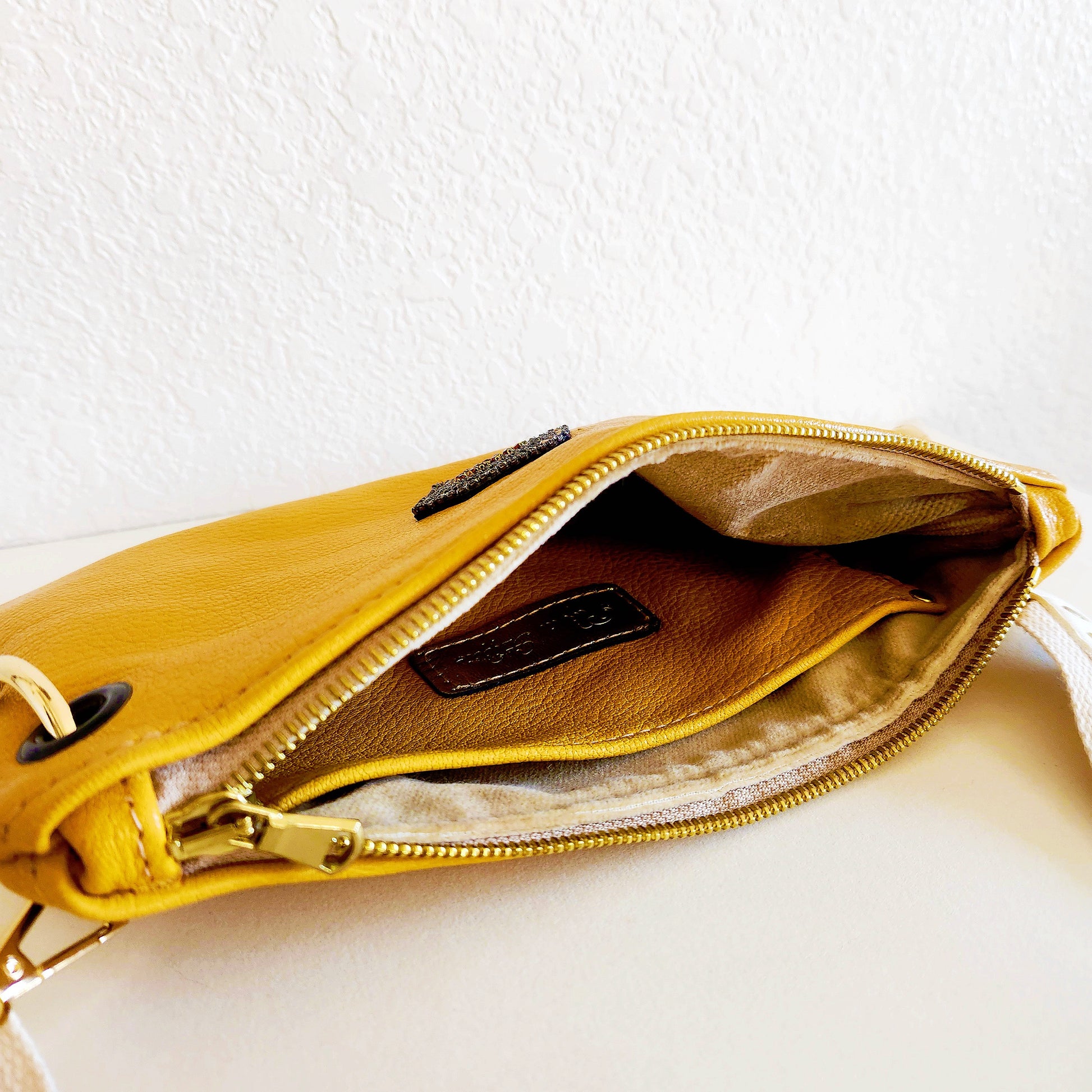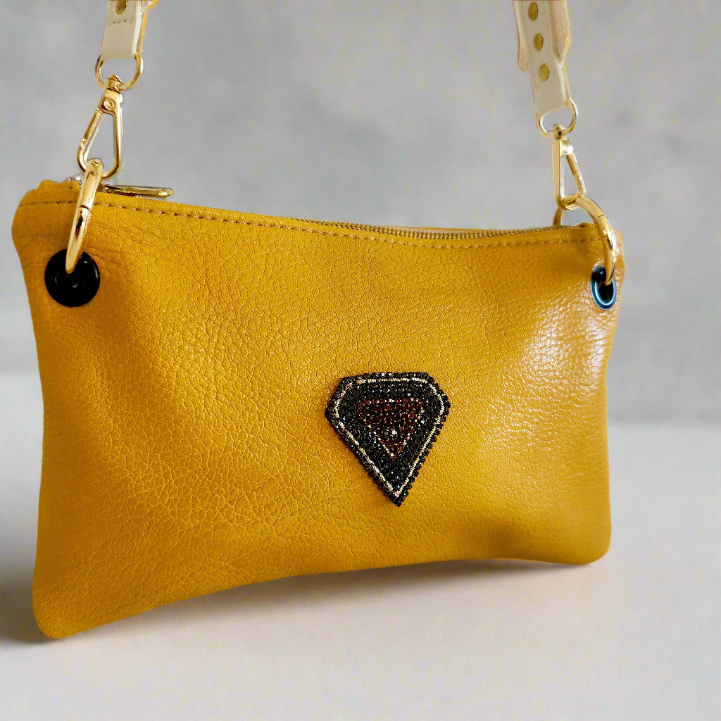 The Mustard Diamond Crossbody combines style and functionality with a sparkling rhinestone focal and a luxurious velvet lining. Crafted in the USA, it features a large inside pocket for organized storage and a durable Italian zipper for smooth access. The adjustable canvas strap ensures a comfortable fit, while its compact dimensions of approximately 6" H x 9.5" W make it perfect for everyday use. This expertly designed crossbody offers both elegance and practicality for the discerning wearer.