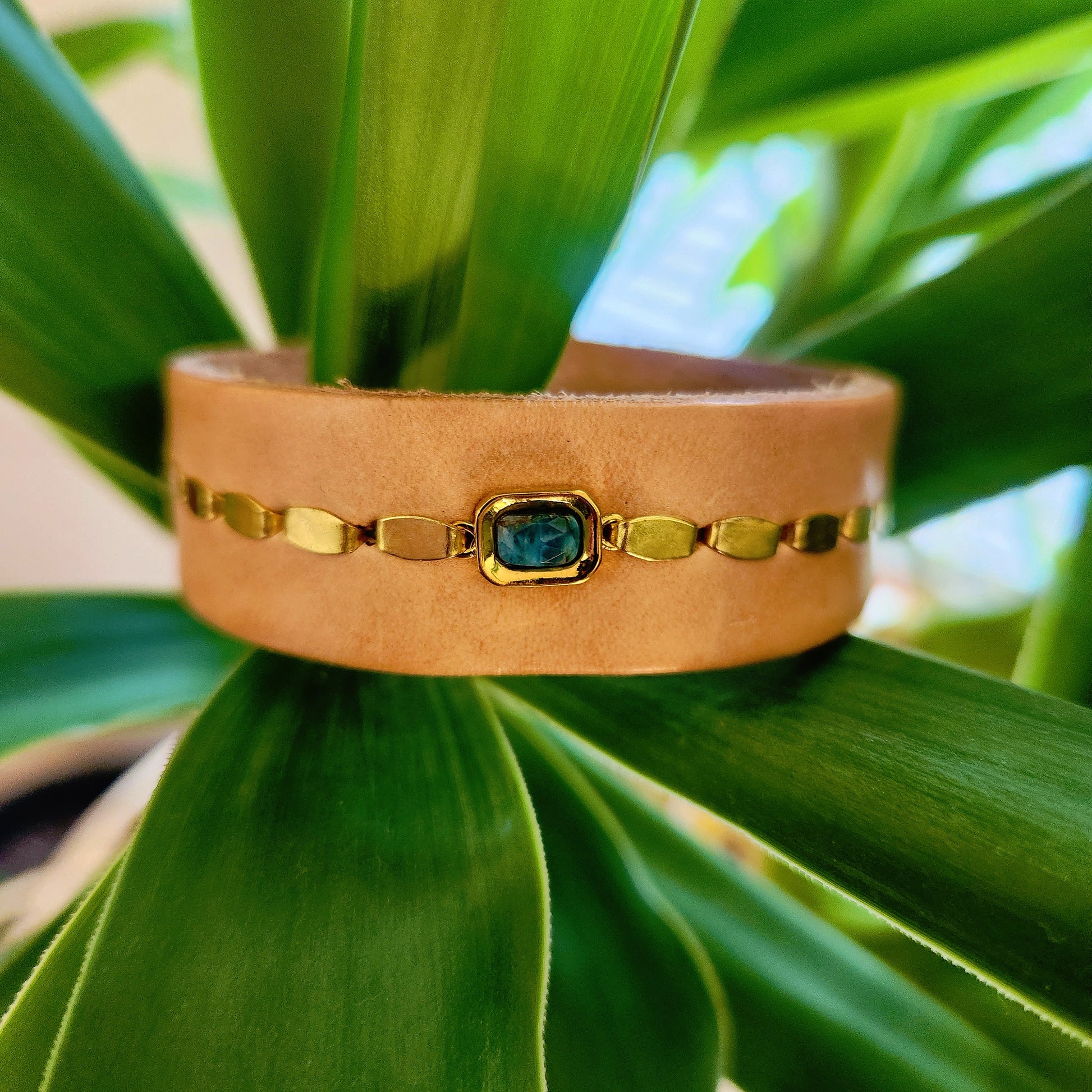 This natural buff Jasper cuff features a striking faceted stone centerpiece, set in 22kt gold overlay for a rich, elegant finish. The adjustable design fits from 7.5 to 8 inches. It's handcrafted, combining artisanal craftsmanship with versatility for everyday wear or special occasions. Ideal for those who appreciate finely detailed and durable jewelry.