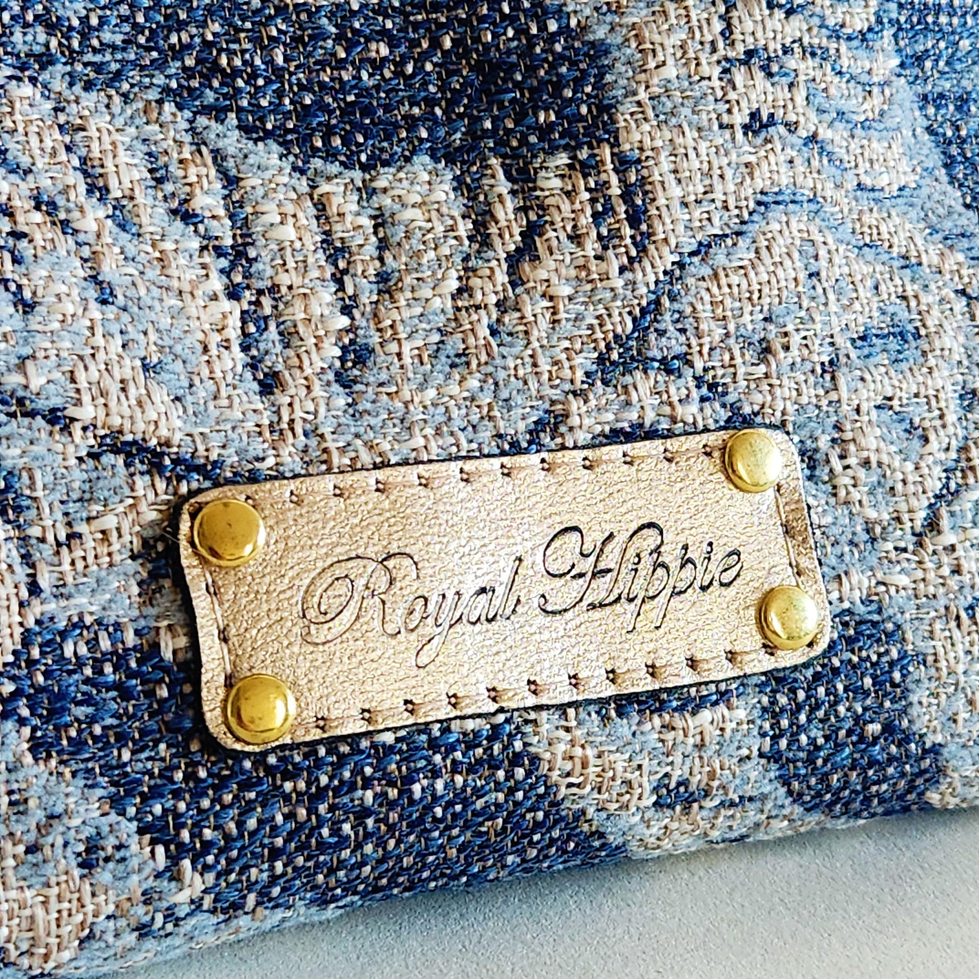 The Tiger Mini Traveler showcases a blend of blues and grey tones, adorned with a mocha leather tassel pull. Its velvet lining enhances durability while providing a plush interior, ideal for safeguarding your essentials. Use it as a pouch or a cosmetic bag. It's Designed to merge style with practical functionality. Approximately 6" H x 10.5 W and 4" deep.