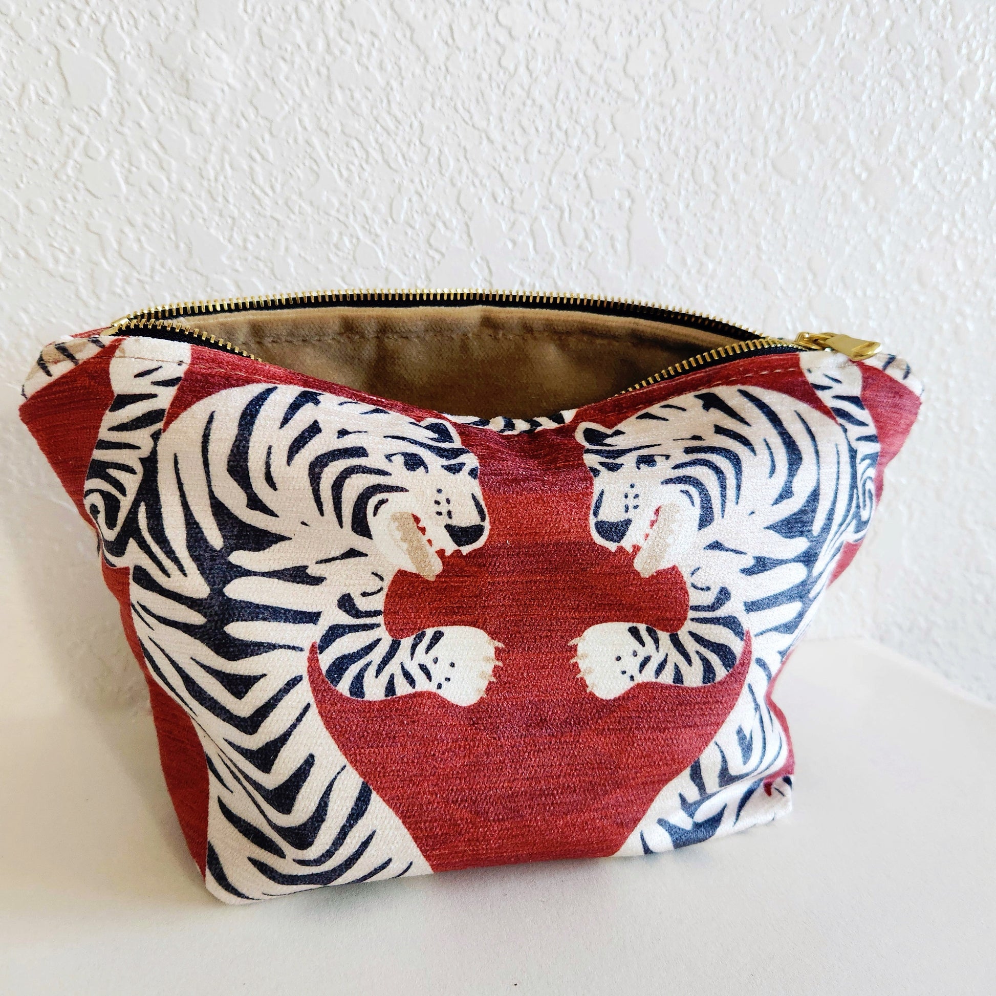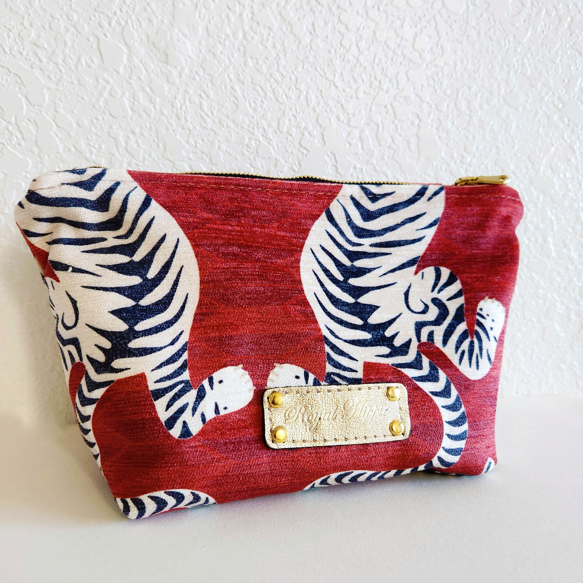 Crafted with luxurious ruby velvet on the exterior and a soft velvet lining inside, the Tiger Velvet Traveller combines elegance with durability. Featuring a high-end Italian zipper. Handcrafted in the USA, it measures 6" H x 10.5" W x 5" D, offering ample space for your essentials while maintaining a refined silhouette. Perfect for those seeking both style and quality.